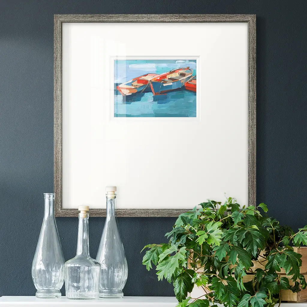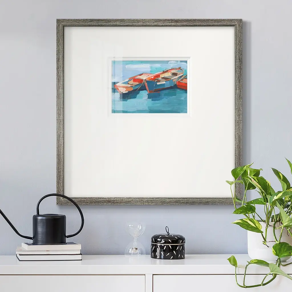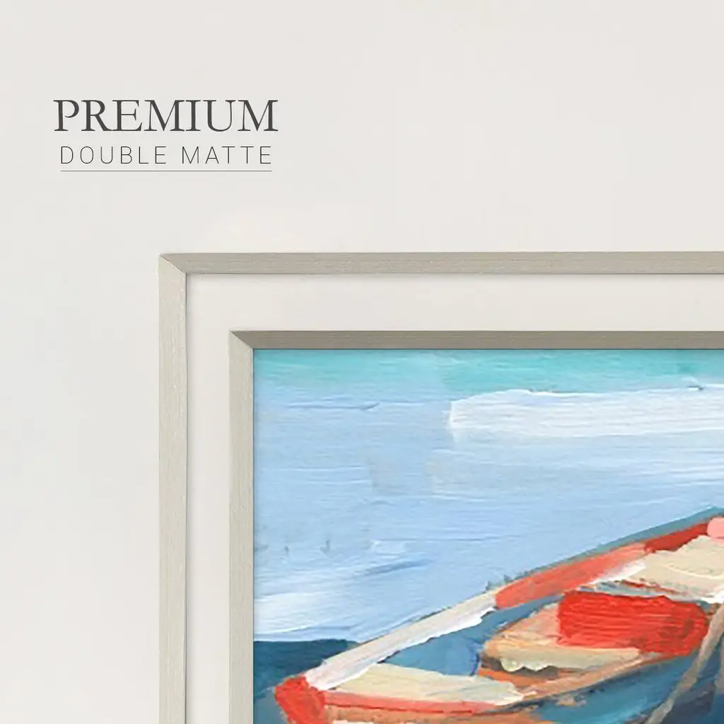 Primary Boats IPremium Framed Print A framed cold pressed paper print featuring superior double matting and quality frame. 2 SIZES AVAILABLE 16''X16''' - Overall Size 20''X20''' - Overall Size Each piece is made to order. Each piece comes with hanging hardware. Made in the USA Ready to Hang Giclee Paper Print Plexiglass Beveled Matt Board Double Matte Board