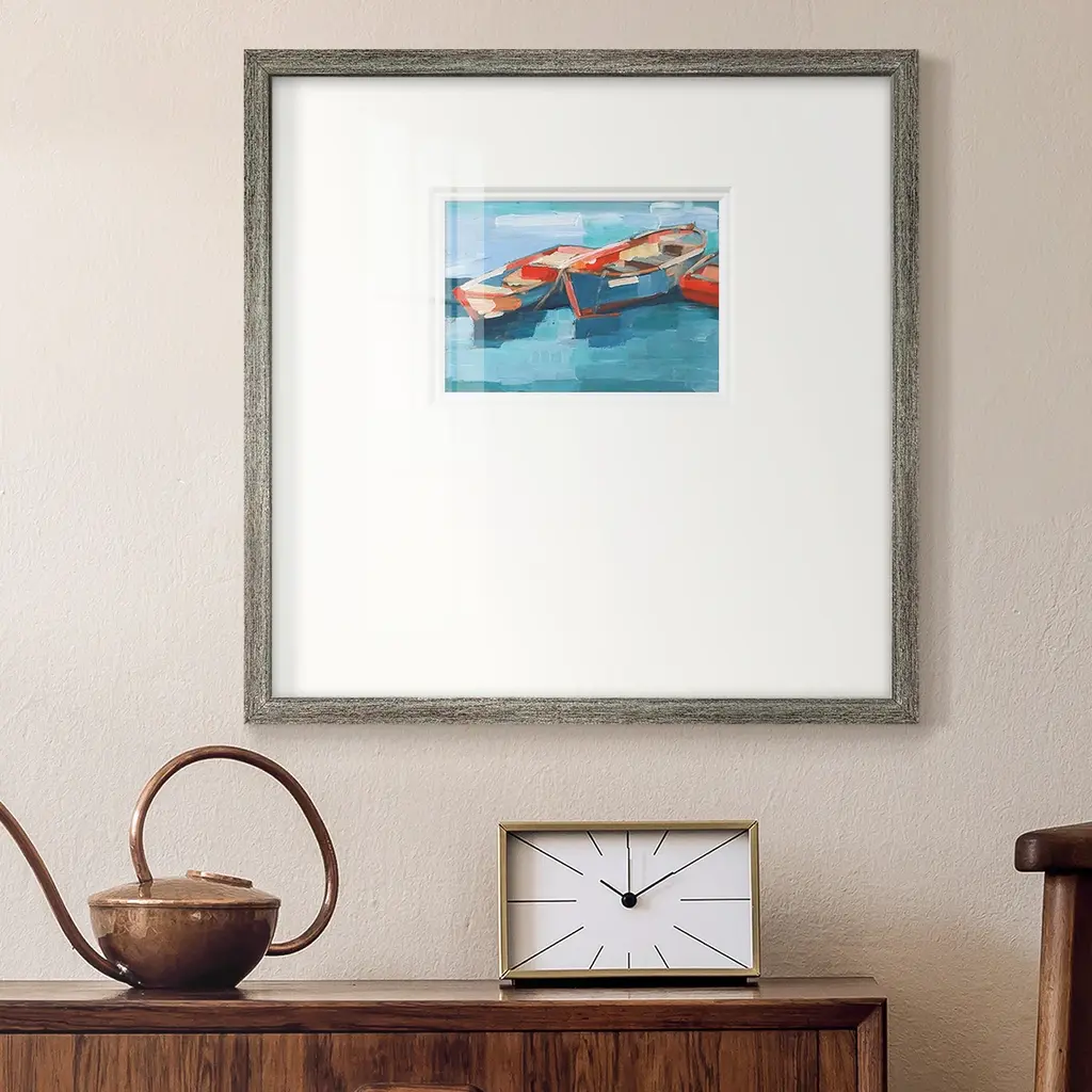 Primary Boats IPremium Framed Print A framed cold pressed paper print featuring superior double matting and quality frame. 2 SIZES AVAILABLE 16''X16''' - Overall Size 20''X20''' - Overall Size Each piece is made to order. Each piece comes with hanging hardware. Made in the USA Ready to Hang Giclee Paper Print Plexiglass Beveled Matt Board Double Matte Board