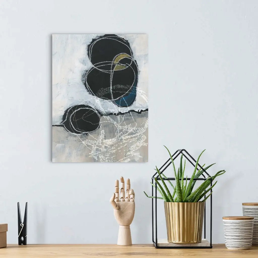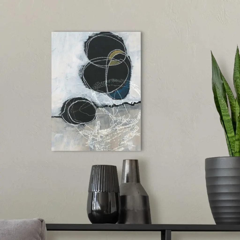 Abstract artwork featuring vertical and horizontal white brush strokes revealing black circular shapes with chalk gestural lines.