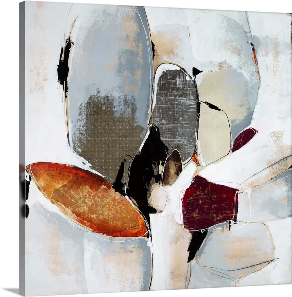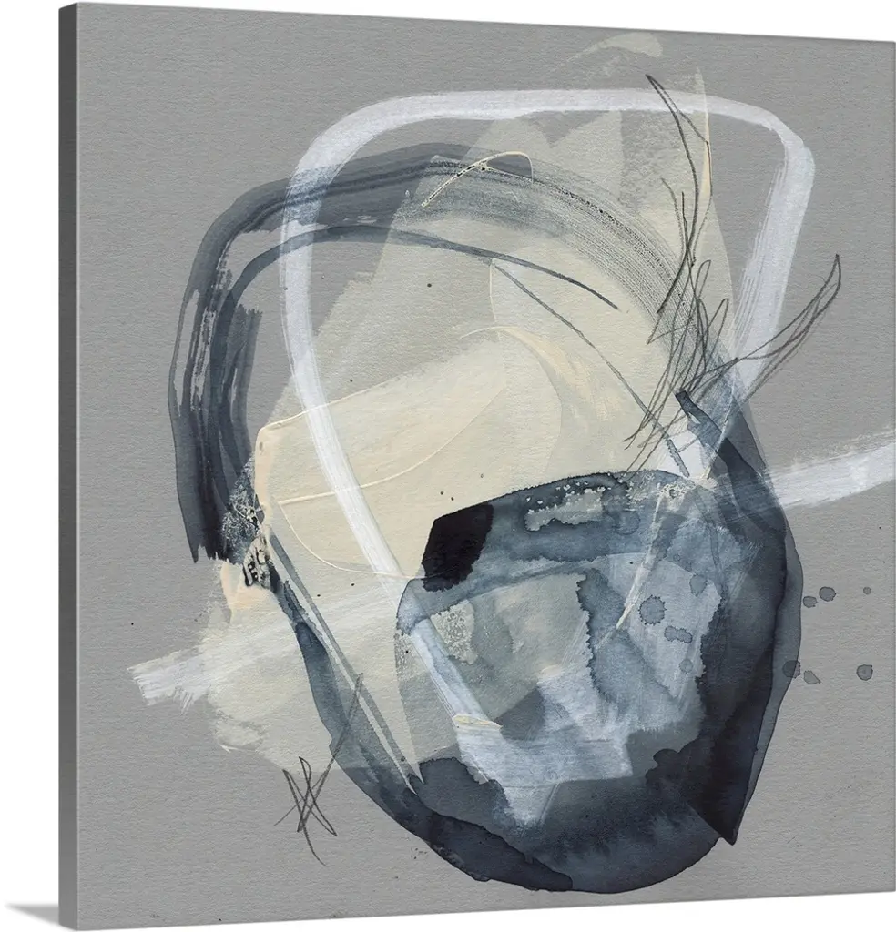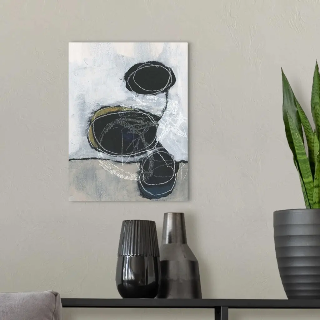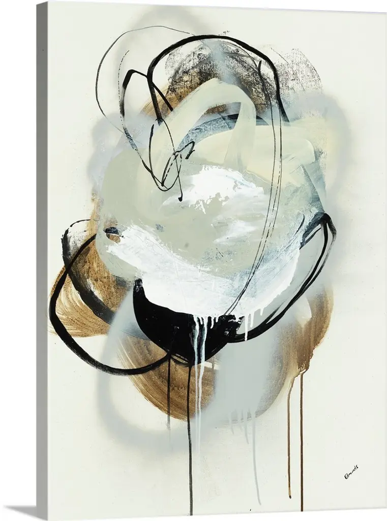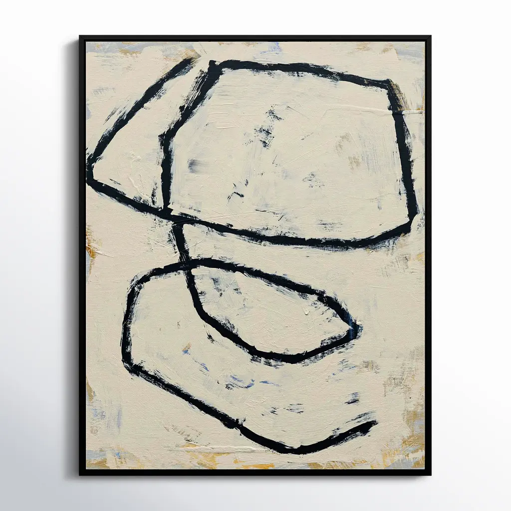 Abstract artwork featuring vertical and horizontal white brush strokes revealing black circular shapes with chalk gestural lines.