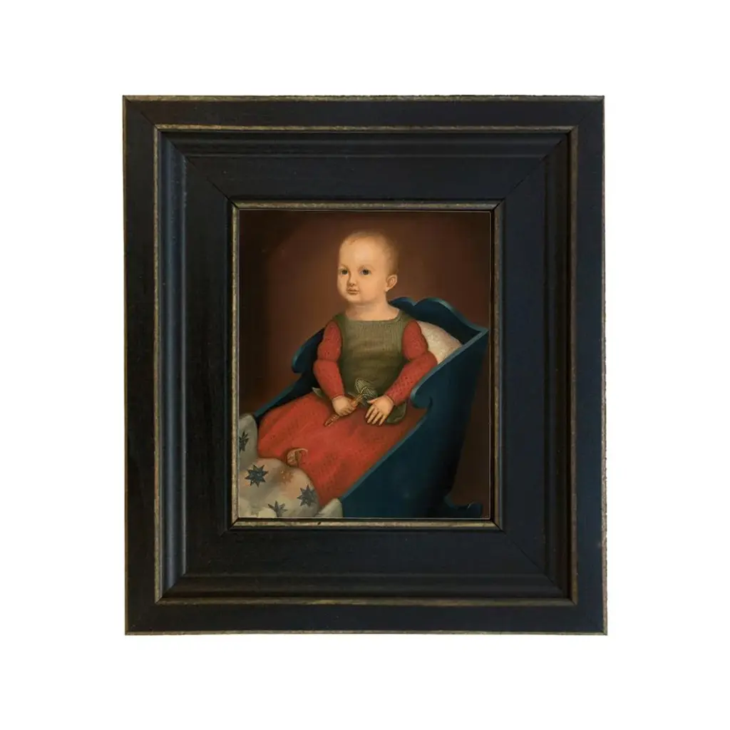 "Primitive Baby In Cradle" Framed Print On Canvas In Distressed Black Wood Frame