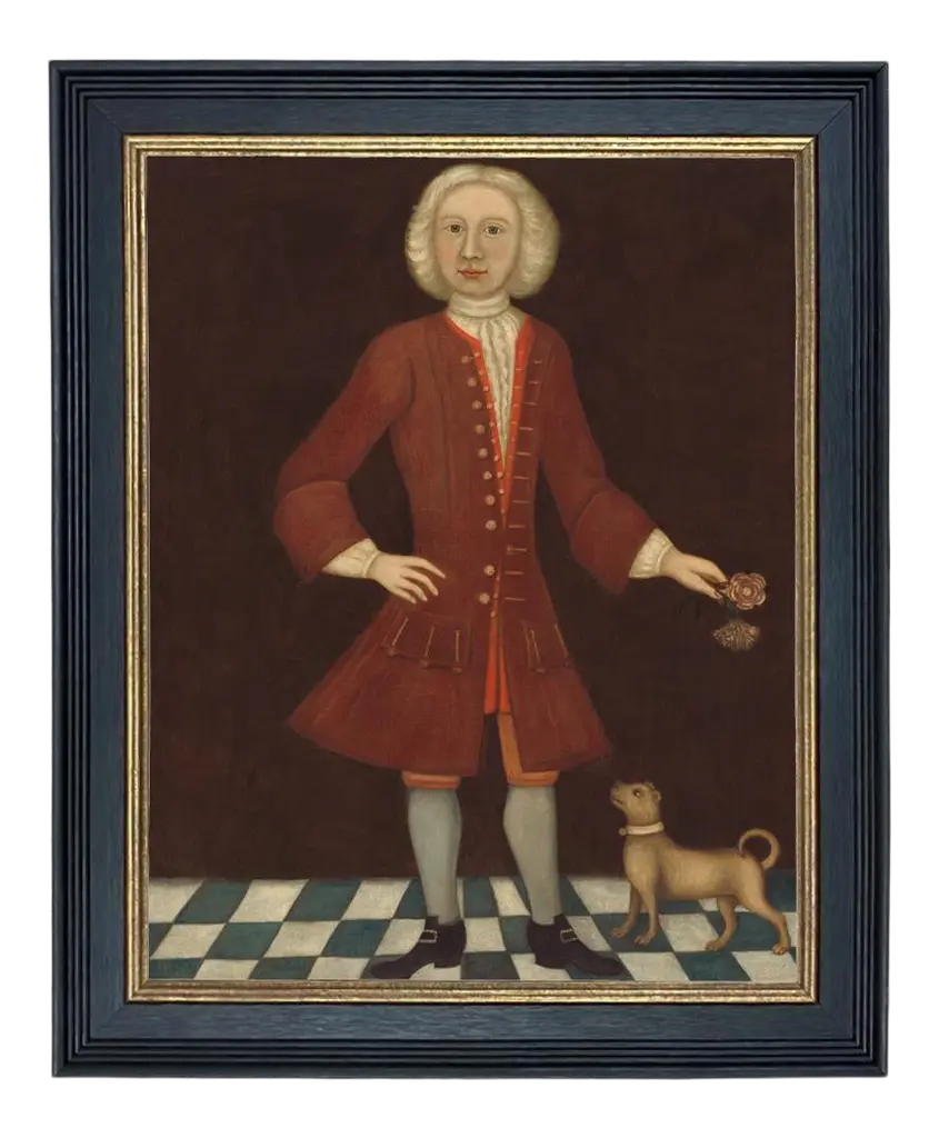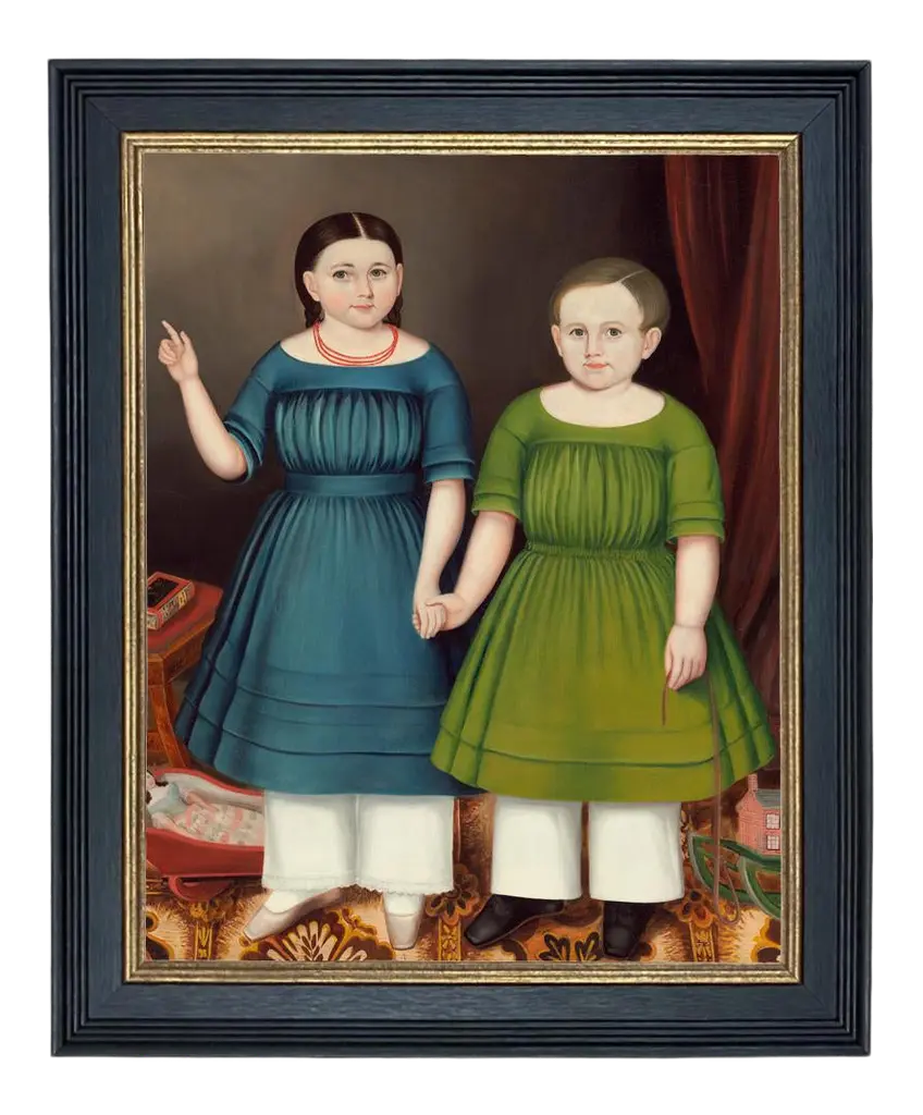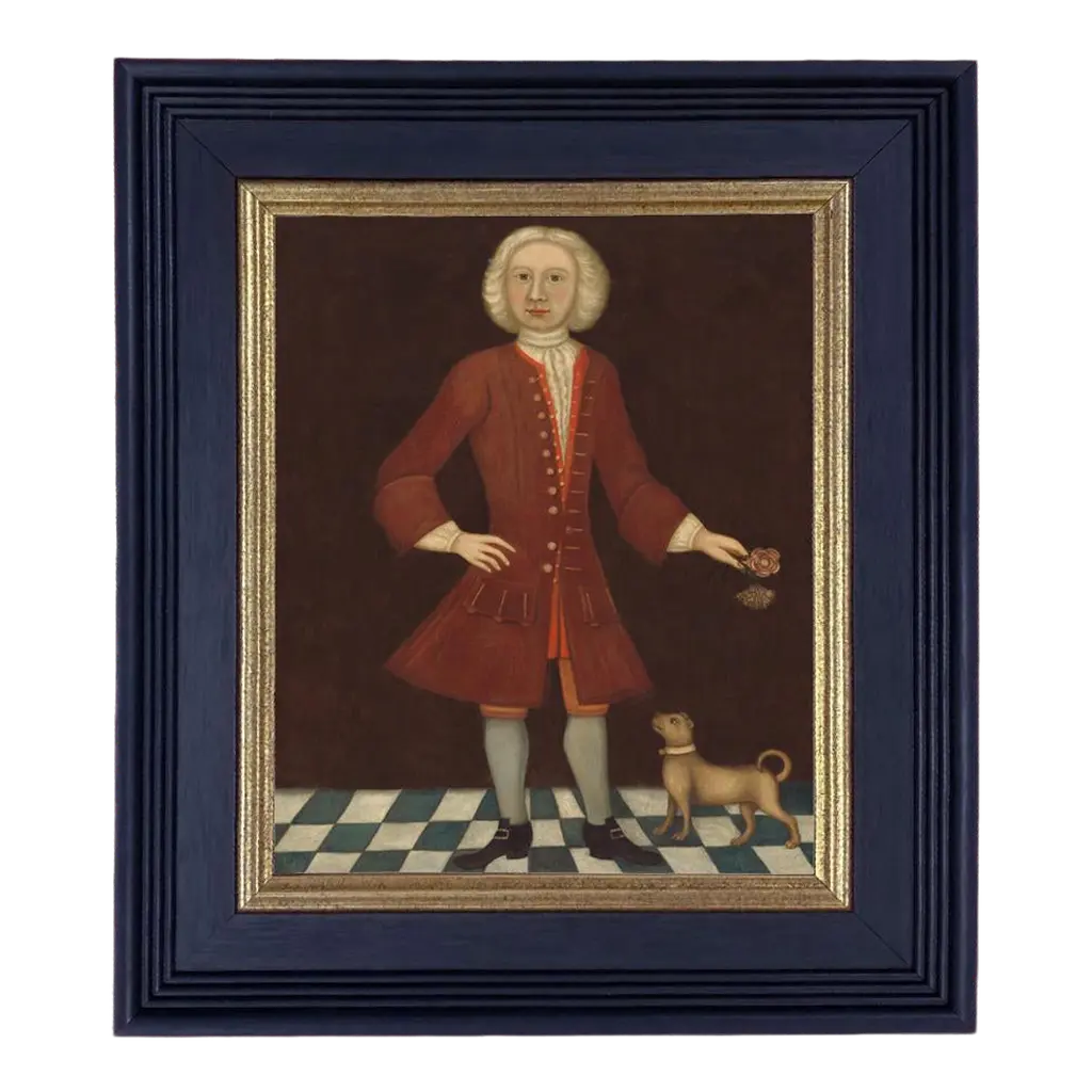 Accurate reproduction of the original oil painting, this image is printed on canvas, mounted to a board and treated with a historic looking varnish. The frame is matte black with distressed edges. The back is finished with craft paper and a sawtooth hanger. Made in the USA. • Painting: 5" x 6" • Finished frame size: 8-1/2" x 9-1/2" • Frame width: 2" • Frame thickness: 3/4"