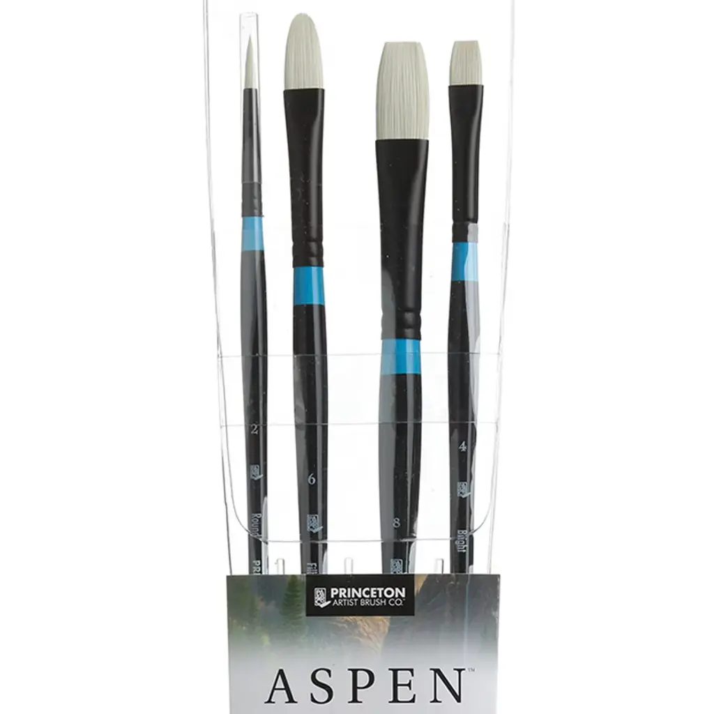 Princeton Aspen Brush Set, Synthetic Bristles, Long Handle Acrylic & Oil Paintbrush, Black, 4 Pieces | Elevate your painting experience with Princeton's Aspen series, a collection of brushes that seamlessly blends performance, practicality, and style. Crafted for both professional artists and passionate amateurs, these brushes are designed to meet the highest standards of quality and reliability. The Aspen series features synthetic bristles that mimic the stiffness of natural fibers, yet maintain their shape and integrity under any conditions—whether you're working on a delicate canvas or a rugged outdoor surface. These bristles stay perfectly aligned, offering exceptional control and precise color placement, allowing you to bring your artistic vision to life with ease. Each brush is thoughtfully designed with a polished black handle made from reforested wood, paired with a matte black, glare-free ferrule that's as stylish as it is functional. Whether you're creating in the studio or capturing the beauty of the outdoors, the Aspen brush set provides the tools you need to craft your next masterpiece with confidence and flair.