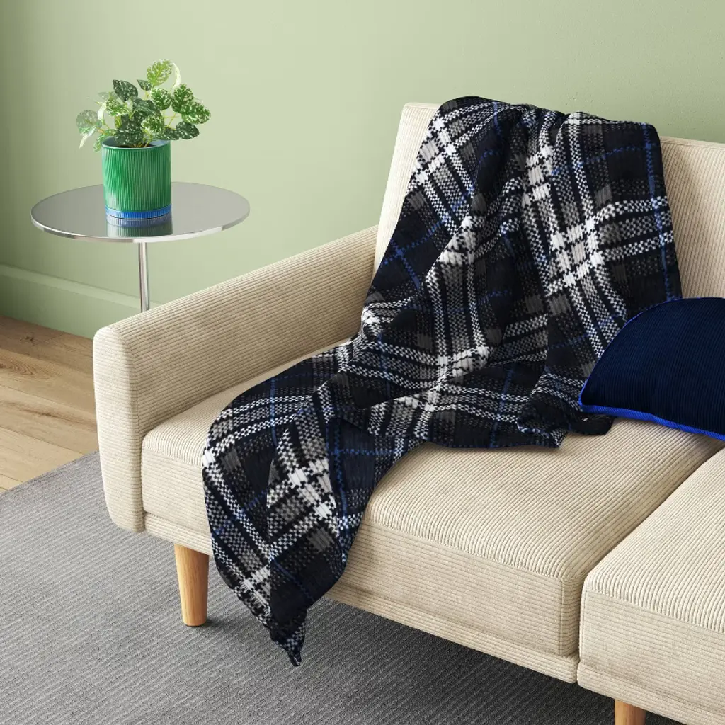 Add a touch of classic charm to your decor with this Printed Plaid Ribbed Plush Throw from Room Essentials™. Made from lightweight recycled polyester, this rectangular blanket showcases a checkered print in navy, light gray and white shades and a ribbed texture for a lovely look. Whether you're snuggling up on a chilly night or adding a stylish accent to your space, it is a must-have accessory, boasting convenience of care with its machine-washable design.Room Essentials™: Everyday Value
