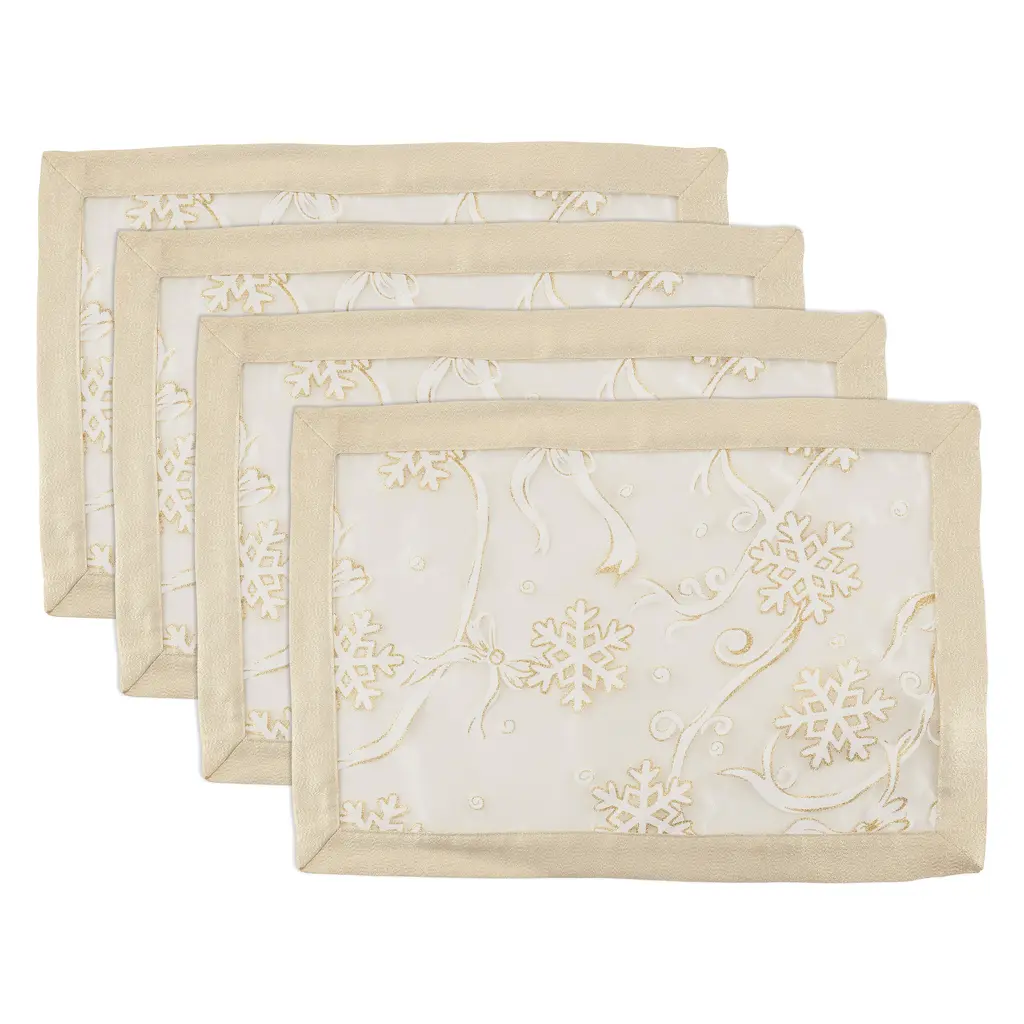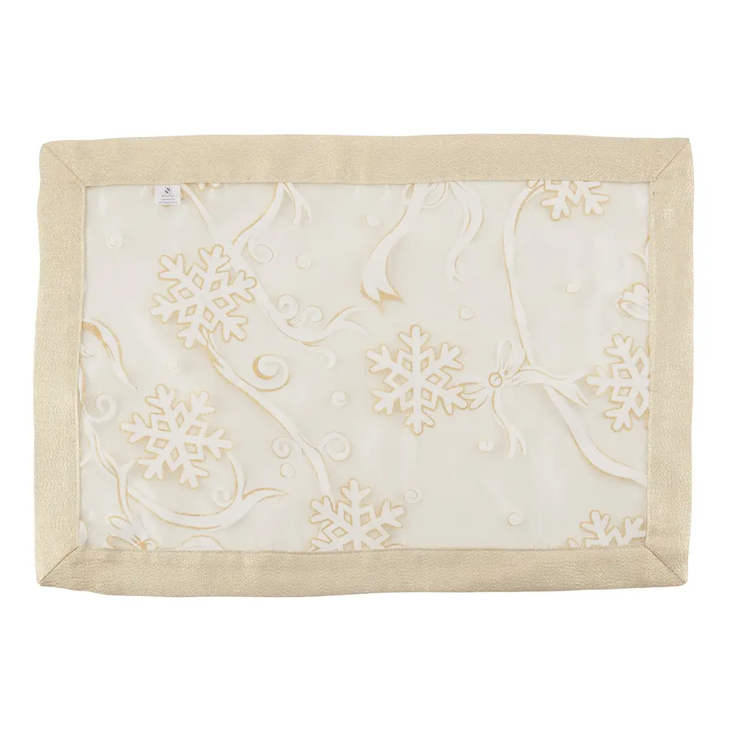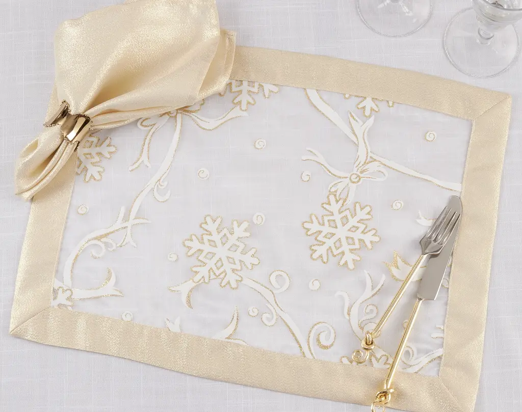 This charming set of Printed Snowflake and Ribbon Placemats is a great way to bring winter's magic right to your tabletop. The delicate design and golden accents add a refined note to your table decor, making it a great choice for entertaining guests or special occasions. Pair with solid colors within the same palette.