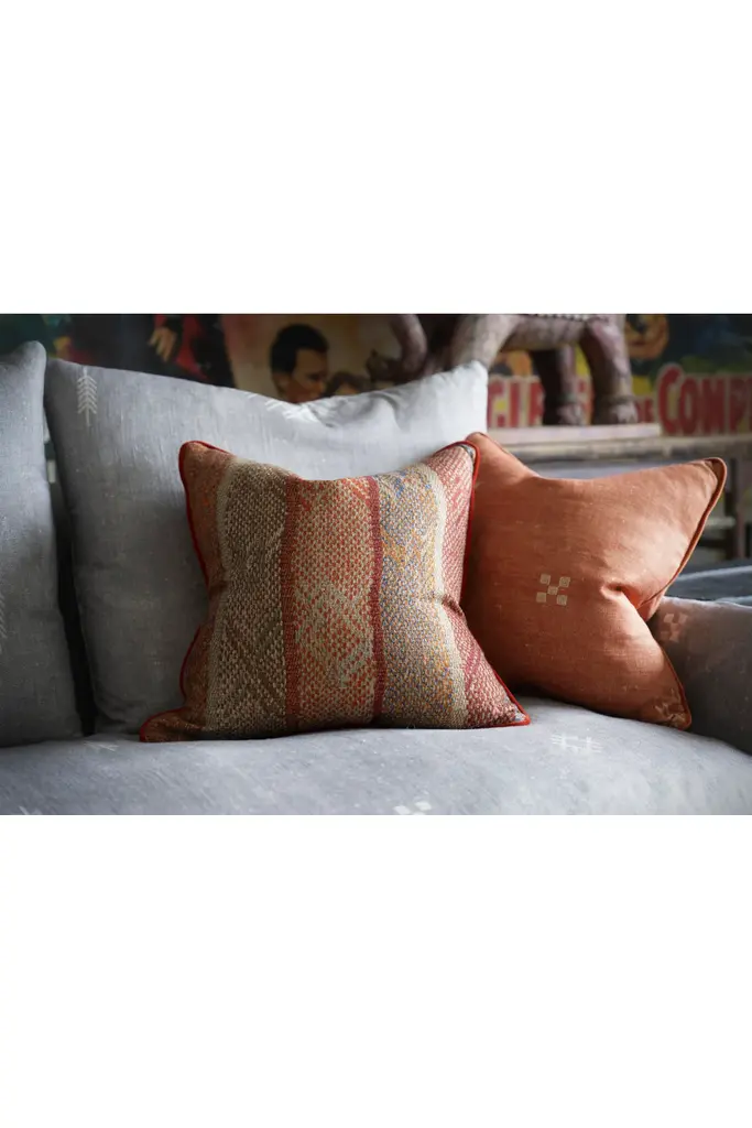 A luxurious cushion made from Jericho, a Moroccan inspired textile with a beautiful, faded ground and wonderful printed stitch motif details, finished in Medici piping. Ideal for injecting color and texture into interiors, or into outdoor spaces using Argonaut outdoor cushions.This cushion is stuffed with our signature plush feather inners, sustainably sourced from Scandinavia, with 50% recycled feather from recycled duvets and jackets. - Green, Orange, Gray, Blue