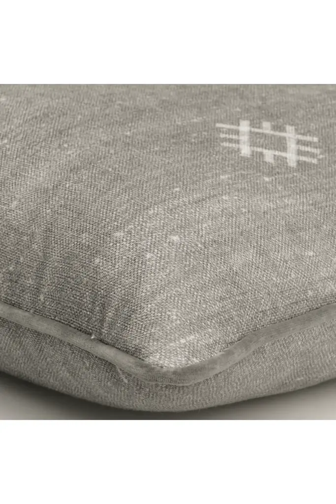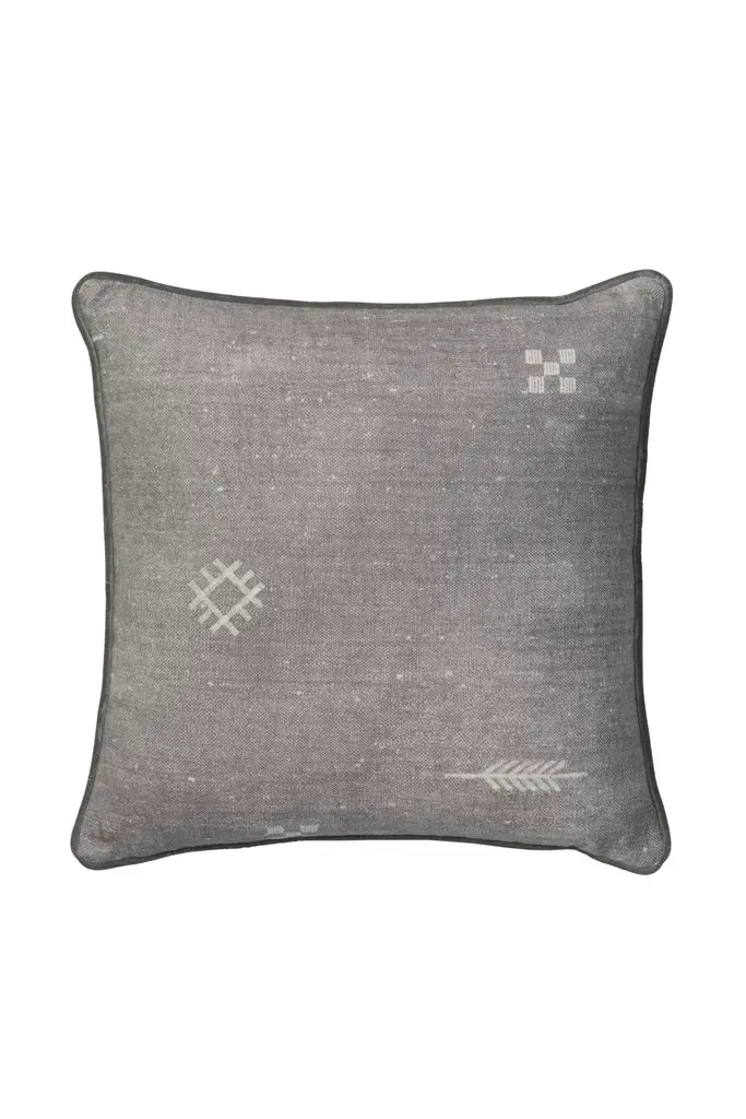 A luxurious cushion made from Jericho, a Moroccan inspired textile with a beautiful, faded ground and wonderful printed stitch motif details, finished in Medici piping. Ideal for injecting color and texture into interiors, or into outdoor spaces using Argonaut outdoor cushions.This cushion is stuffed with our signature plush feather inners, sustainably sourced from Scandinavia, with 50% recycled feather from recycled duvets and jackets. - Green, Orange, Gray, Blue