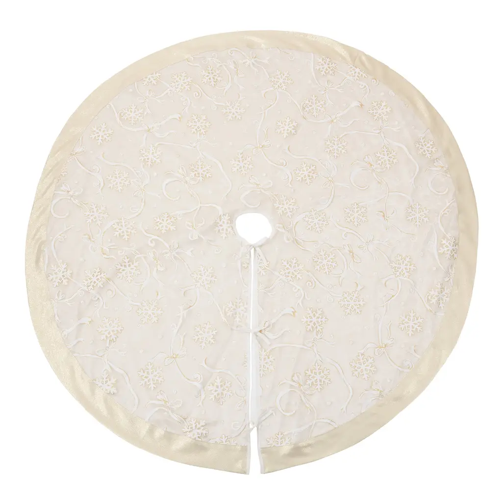 Highly versatile, this chic Snowflake and Ribbon Design Tree Skirt not only protects your floor, but also elevates the style of your home. It's a great backdrop for your holiday decor, bringing texture and refinement to the mix. Features: