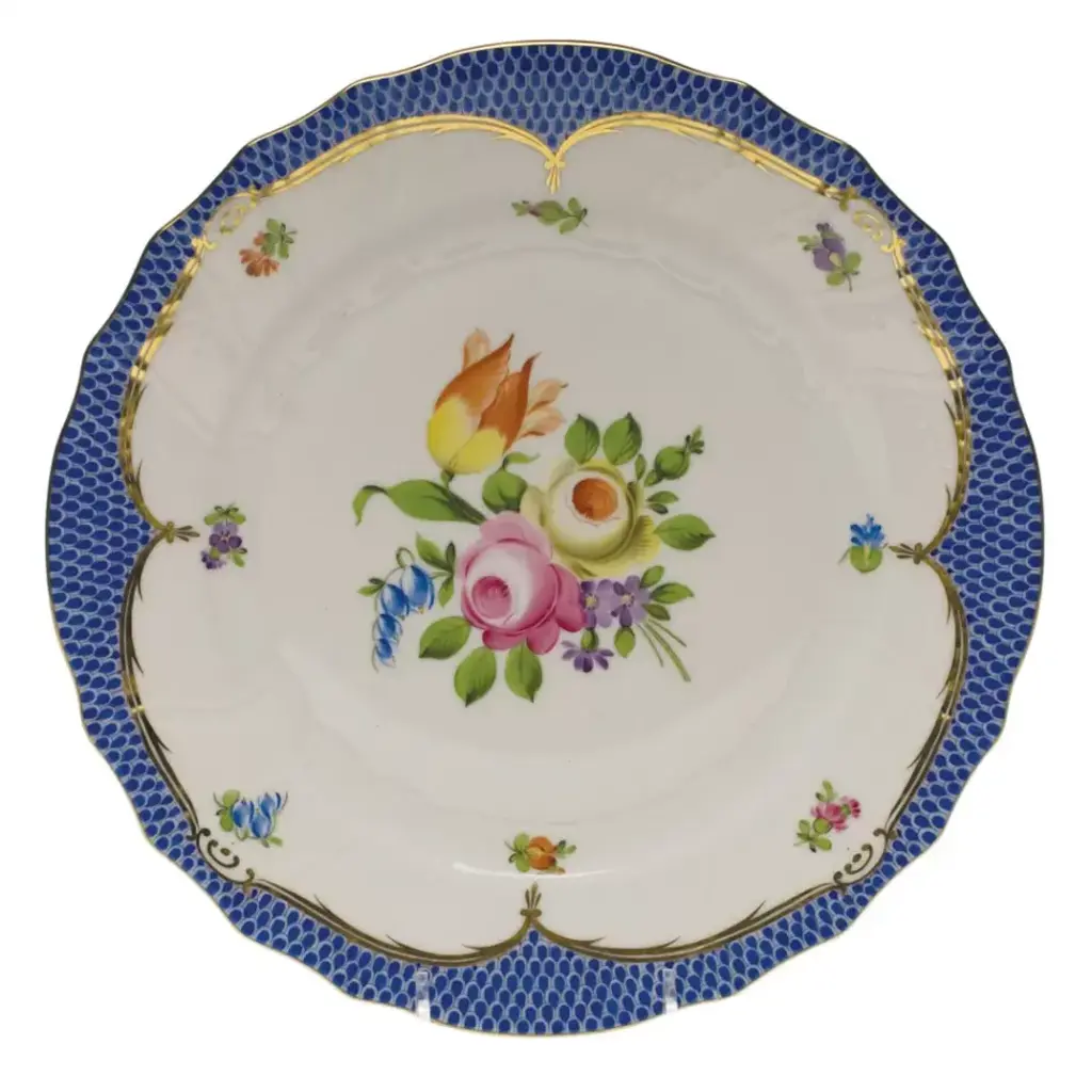 Similar to the Printemps collection but with a blue border, these brilliantly colored spring flowers are painted with uncharacteristically bold brushstrokes in this 1920s-era design. Hand painted in Hungary. Now the biggest porcelain manufactory in Europe, Herend was founded in 1826 to produce earthenware in the small Hungarian village for which it was named. At the time, Hungary was flooded with low-cost pottery, but in 1839, Mor Fischer became the Manufactory’s new owner and he decided to focus on producing dinnerware replacement pieces for Europe’s royal families to complement their valuable porcelain patterns from Germany and the Far East. As his client base grew, Fischer commissioned his artists to begin designing dinnerware patterns of their own. Queen Victoria’s 1851 purchase of a large set for Windsor Castle was a milestone, setting the stage for aristocrats throughout Europe to clamor for Herend in their estates. In the 1850s, Herend added meticulously-crafted figurines to its creations. Herend’s trademark fishnet pattern, which is widely recognized and prized as Herend’s signature design, started in 1858 when an artist who was intrigued with a Chinese plate’s fish scale design painted it onto a rooster figurine to imitate feathers.