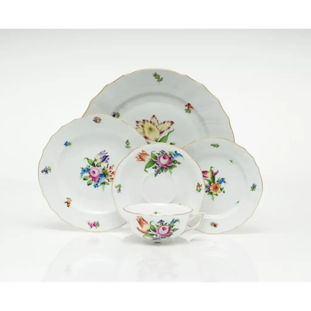 Brilliantly colored spring flowers are painted with uncharacteristically bold brushstrokes in this 1920s-era design. Hand painted in Hungary. Now the biggest porcelain manufactory in Europe, Herend was founded in 1826 to produce earthenware in the small Hungarian village for which it was named. At the time, Hungary was flooded with low-cost pottery, but in 1839, Mor Fischer became the Manufactory’s new owner and he decided to focus on producing dinnerware replacement pieces for Europe’s royal families to complement their valuable porcelain patterns from Germany and the Far East. As his client base grew, Fischer commissioned his artists to begin designing dinnerware patterns of their own. Queen Victoria’s 1851 purchase of a large set for Windsor Castle was a milestone, setting the stage for aristocrats throughout Europe to clamor for Herend in their estates. In the 1850s, Herend added meticulously-crafted figurines to its creations. Herend’s trademark fishnet pattern, which is widely recognized and prized as Herend’s signature design, started in 1858 when an artist who was intrigued with a Chinese plate’s fish scale design painted it onto a rooster figurine to imitate feathers.