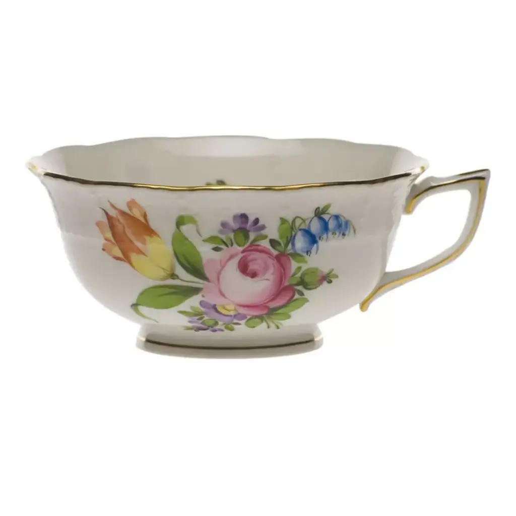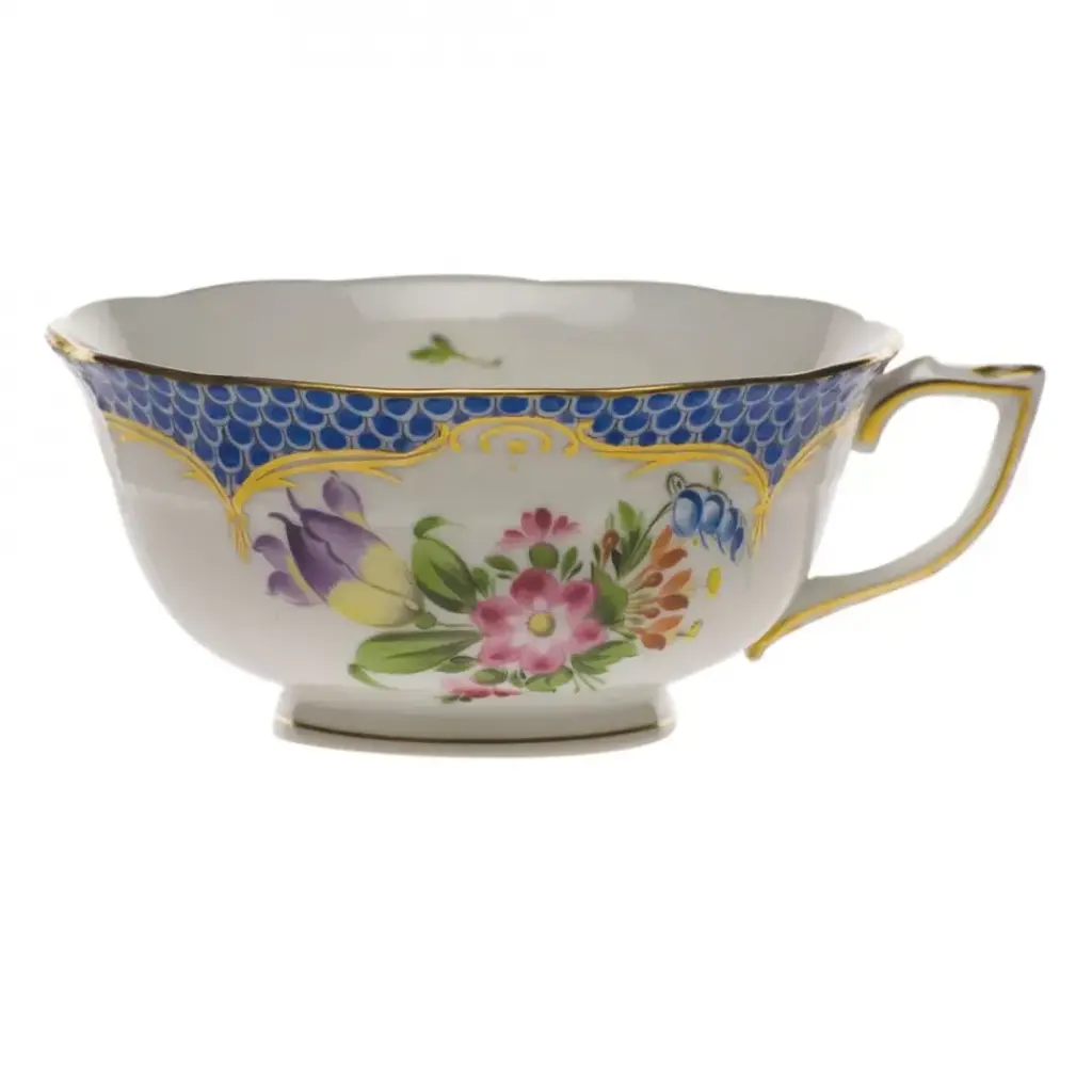 Similar to the Printemps collection but with a blue border, these brilliantly colored spring flowers are painted with uncharacteristically bold brushstrokes in this 1920s-era design. Hand painted in Hungary. Now the biggest porcelain manufactory in Europe, Herend was founded in 1826 to produce earthenware in the small Hungarian village for which it was named. At the time, Hungary was flooded with low-cost pottery, but in 1839, Mor Fischer became the Manufactory’s new owner and he decided to focus on producing dinnerware replacement pieces for Europe’s royal families to complement their valuable porcelain patterns from Germany and the Far East. As his client base grew, Fischer commissioned his artists to begin designing dinnerware patterns of their own. Queen Victoria’s 1851 purchase of a large set for Windsor Castle was a milestone, setting the stage for aristocrats throughout Europe to clamor for Herend in their estates. In the 1850s, Herend added meticulously-crafted figurines to its creations. Herend’s trademark fishnet pattern, which is widely recognized and prized as Herend’s signature design, started in 1858 when an artist who was intrigued with a Chinese plate’s fish scale design painted it onto a rooster figurine to imitate feathers.