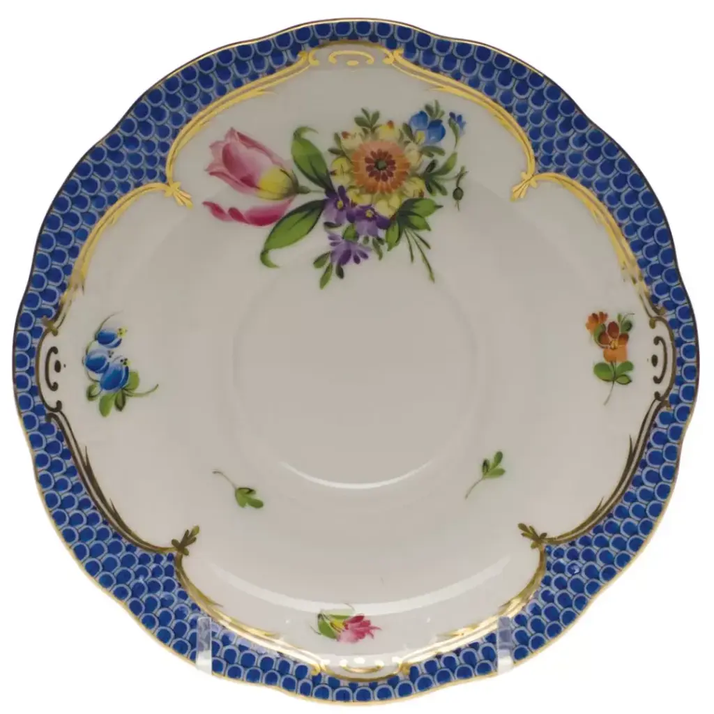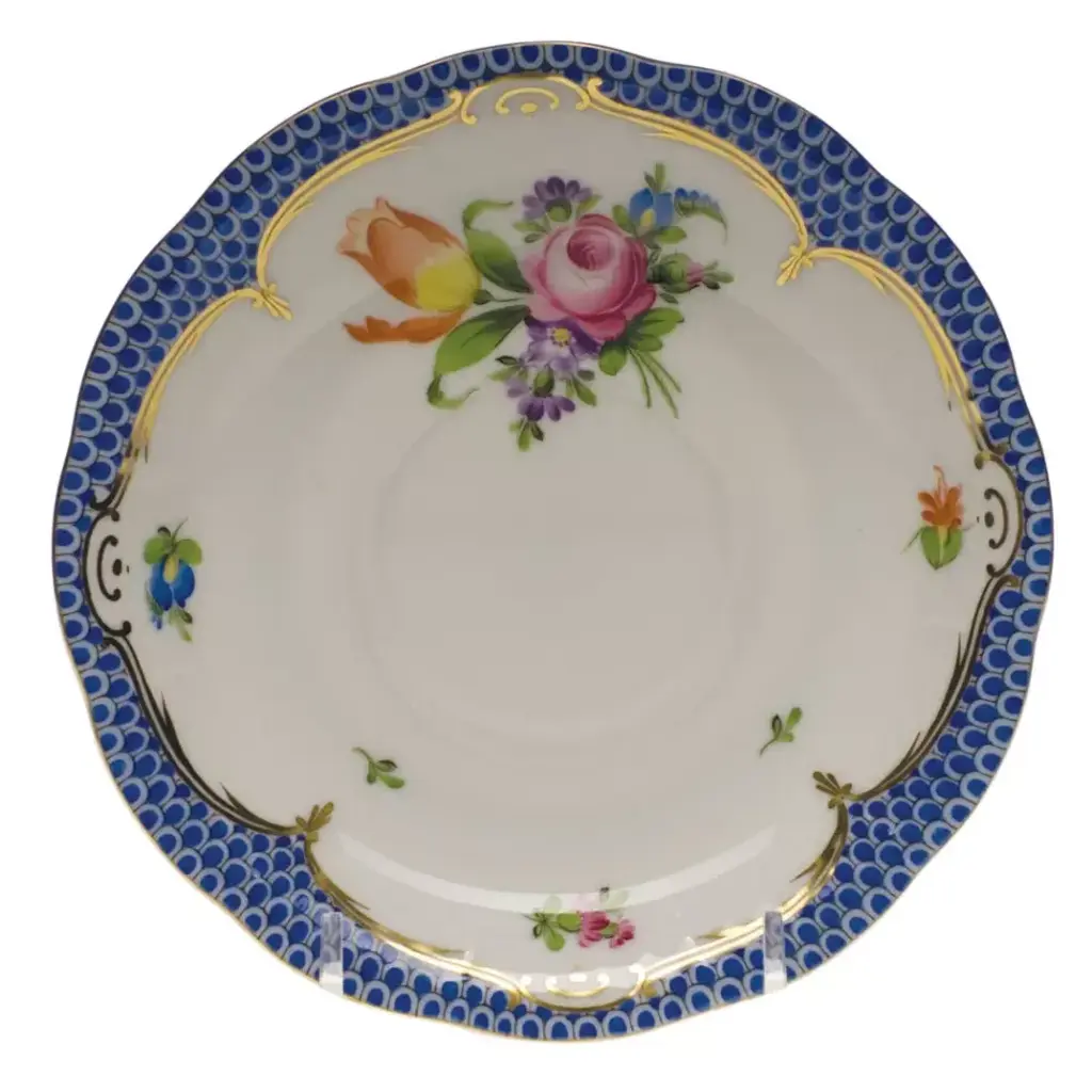 Similar to the Printemps collection but with a blue border, these brilliantly colored spring flowers are painted with uncharacteristically bold brushstrokes in this 1920s-era design. Hand painted in Hungary. Now the biggest porcelain manufactory in Europe, Herend was founded in 1826 to produce earthenware in the small Hungarian village for which it was named. At the time, Hungary was flooded with low-cost pottery, but in 1839, Mor Fischer became the Manufactory’s new owner and he decided to focus on producing dinnerware replacement pieces for Europe’s royal families to complement their valuable porcelain patterns from Germany and the Far East. As his client base grew, Fischer commissioned his artists to begin designing dinnerware patterns of their own. Queen Victoria’s 1851 purchase of a large set for Windsor Castle was a milestone, setting the stage for aristocrats throughout Europe to clamor for Herend in their estates. In the 1850s, Herend added meticulously-crafted figurines to its creations. Herend’s trademark fishnet pattern, which is widely recognized and prized as Herend’s signature design, started in 1858 when an artist who was intrigued with a Chinese plate’s fish scale design painted it onto a rooster figurine to imitate feathers.