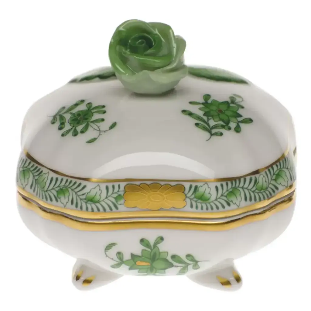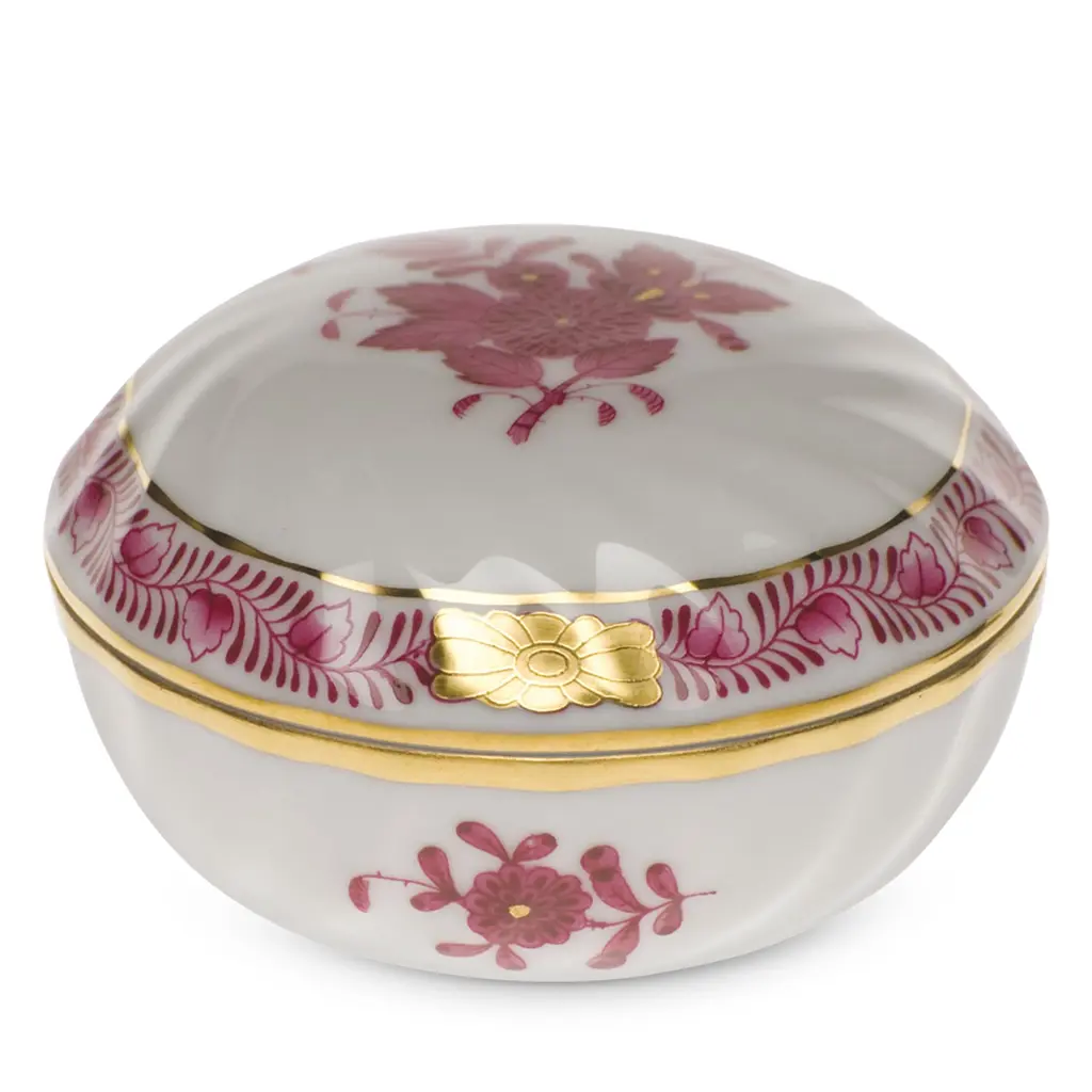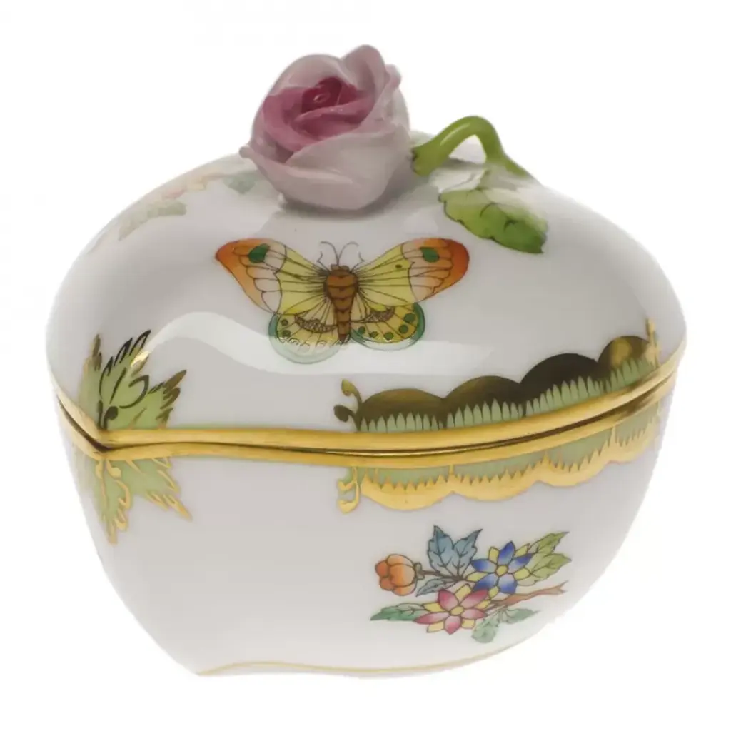 Brilliantly colored spring flowers are painted with uncharacteristically bold brushstrokes in this 1920s-era design. Hand painted in Hungary. Now the biggest porcelain manufactory in Europe, Herend was founded in 1826 to produce earthenware in the small Hungarian village for which it was named. At the time, Hungary was flooded with low-cost pottery, but in 1839, Mor Fischer became the Manufactory’s new owner and he decided to focus on producing dinnerware replacement pieces for Europe’s royal families to complement their valuable porcelain patterns from Germany and the Far East. As his client base grew, Fischer commissioned his artists to begin designing dinnerware patterns of their own. Queen Victoria’s 1851 purchase of a large set for Windsor Castle was a milestone, setting the stage for aristocrats throughout Europe to clamor for Herend in their estates. In the 1850s, Herend added meticulously-crafted figurines to its creations. Herend’s trademark fishnet pattern, which is widely recognized and prized as Herend’s signature design, started in 1858 when an artist who was intrigued with a Chinese plate’s fish scale design painted it onto a rooster figurine to imitate feathers.