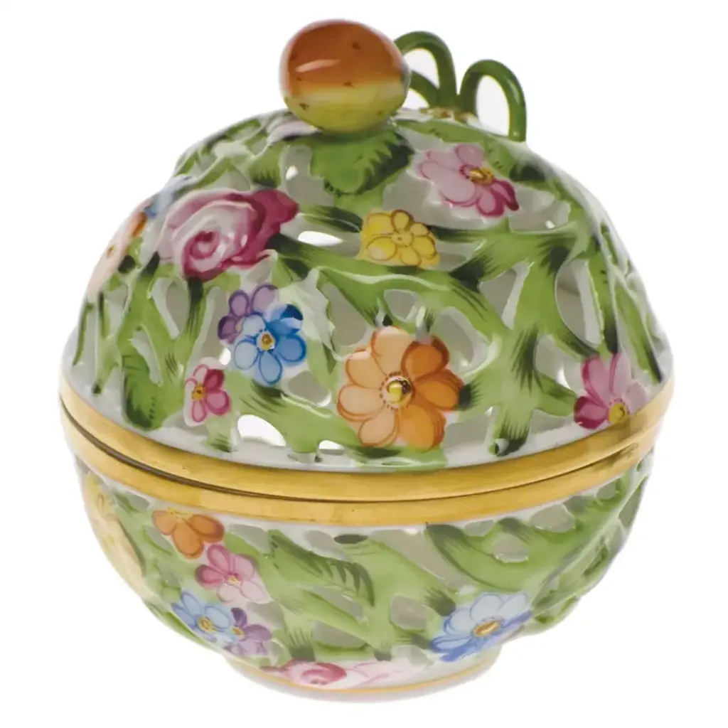 Brilliantly colored spring flowers are painted with uncharacteristically bold brushstrokes in this 1920s-era design. Hand painted in Hungary. Now the biggest porcelain manufactory in Europe, Herend was founded in 1826 to produce earthenware in the small Hungarian village for which it was named. At the time, Hungary was flooded with low-cost pottery, but in 1839, Mor Fischer became the Manufactory’s new owner and he decided to focus on producing dinnerware replacement pieces for Europe’s royal families to complement their valuable porcelain patterns from Germany and the Far East. As his client base grew, Fischer commissioned his artists to begin designing dinnerware patterns of their own. Queen Victoria’s 1851 purchase of a large set for Windsor Castle was a milestone, setting the stage for aristocrats throughout Europe to clamor for Herend in their estates. In the 1850s, Herend added meticulously-crafted figurines to its creations. Herend’s trademark fishnet pattern, which is widely recognized and prized as Herend’s signature design, started in 1858 when an artist who was intrigued with a Chinese plate’s fish scale design painted it onto a rooster figurine to imitate feathers.