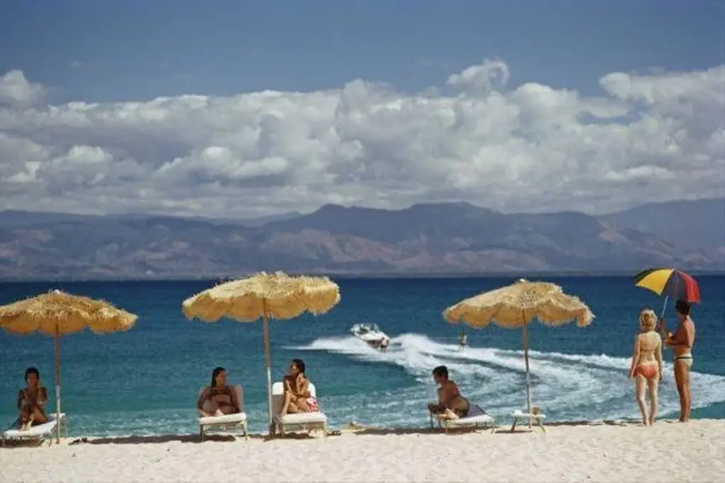 Private Island, Philippines 1973 Guests relax on the beach of a private island owned by Philippine Airlines President, Benigno Toda Jr., Philippines, February 1973. (Photo by Slim Aarons) Slim Aarons was one of the twentieth century’s most prolific documenters of celebrity and socialite life. Over six decades, Aarons photographed some of the world’s most beautiful people in some of the globes most desirable destinations: jet-setting from Beverly Hills to Capri to the French Riviera, Aarons snapped the likes of the Kennedy family, Humphrey Bogart, Marilyn Monroe, and Grace Kelly. Paper size - 40x60" / 101x152 cm Approx frame size - 47x67" / 119x170 cm Stamped and issued by the Getty Images Archive London England (sole owners of the Slim Aarons Collection) made utilising the original transparency c print Framed in black solid wood frame with mount and glazing - ready to hang Shipped securely, cost includes crating where necessary