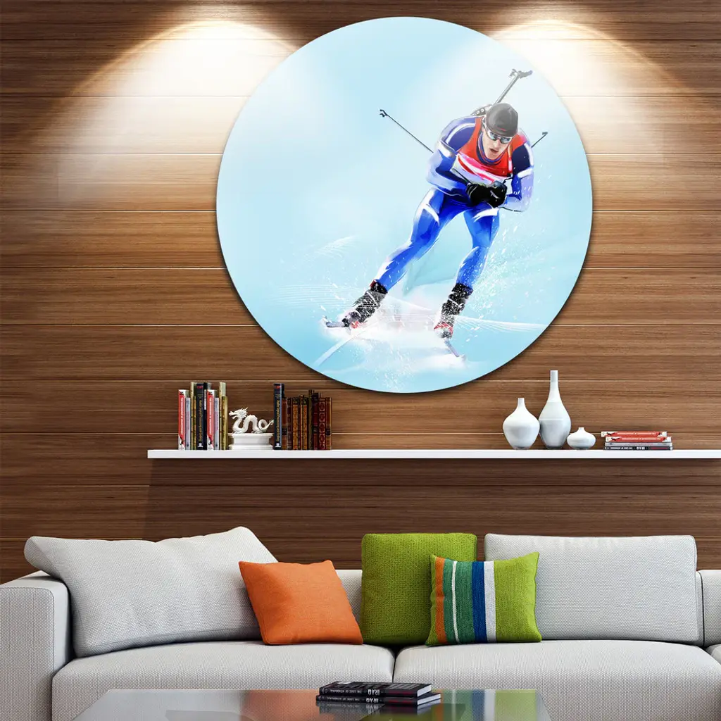 Bring Contemporary Abstraction to your home with this large Circle Metal wall art. This Professional Male Skier Metal Artwork makes it the focal point of any room or office. - White Gloss Coating ensures colors are extra vibrant with light reflection.- Aluminum grade Sheet Metal with 1 inch mounting frame on the back giving the illusion that the artwork is floating on the wall..- Mounting Brackets are included along with instructions.- High Quality Digital images are created directly into a glossy aluminum panel producing a stunning and captivating print into the glossy finish of the metal.- Water, Fire and Scratch resistant HD Aluminum panels.- Looks better than any photo paper and guaranteed to last at least 20 years- Easy to clean with a microfiber cloth. Colors are far superior to regular Canvas Art. - Easy to Hang
