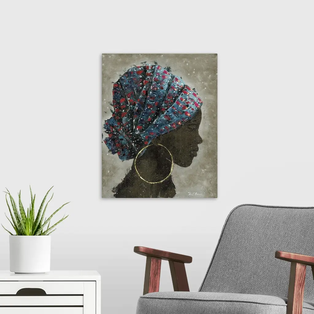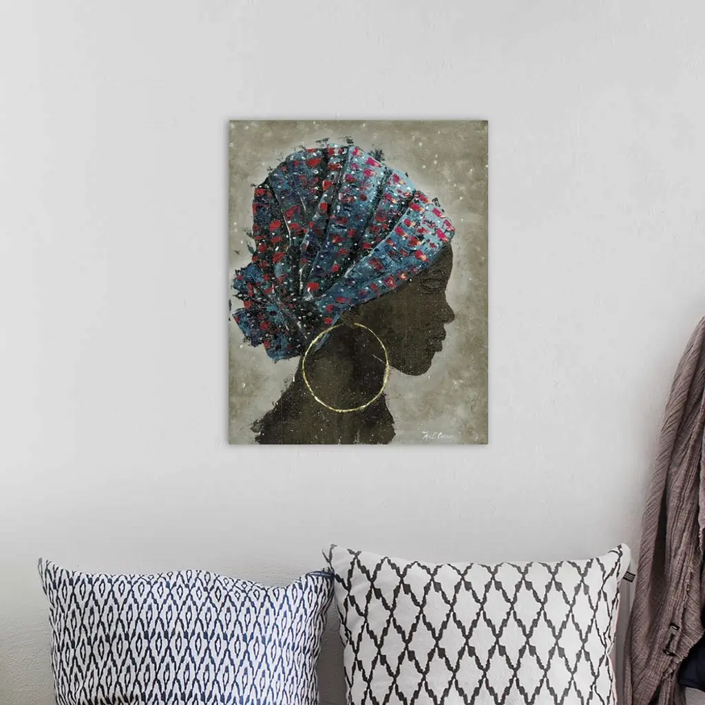 A textured painting of a portrait of a woman with large hooped earrings and a colorful head scarf.