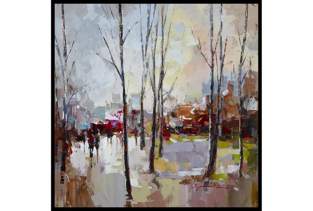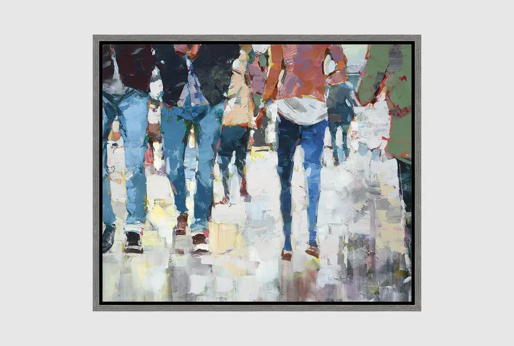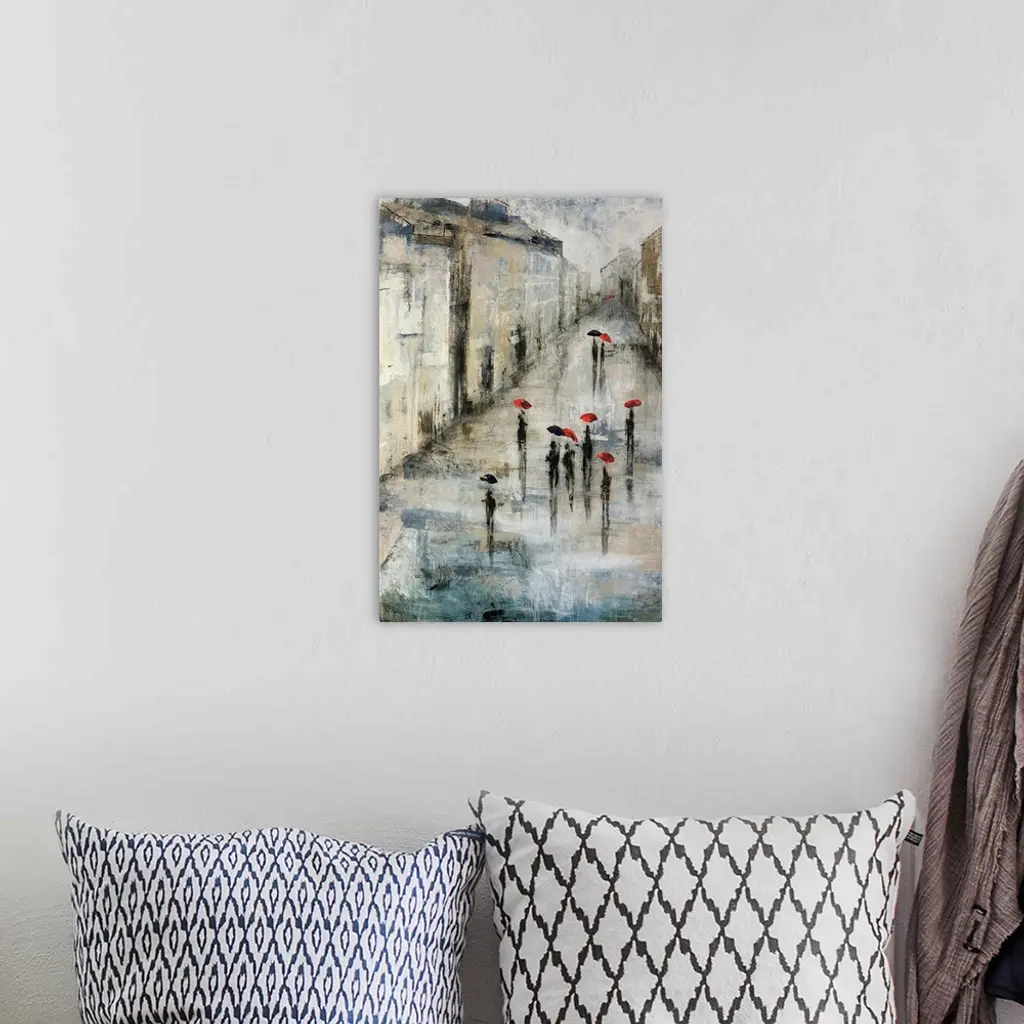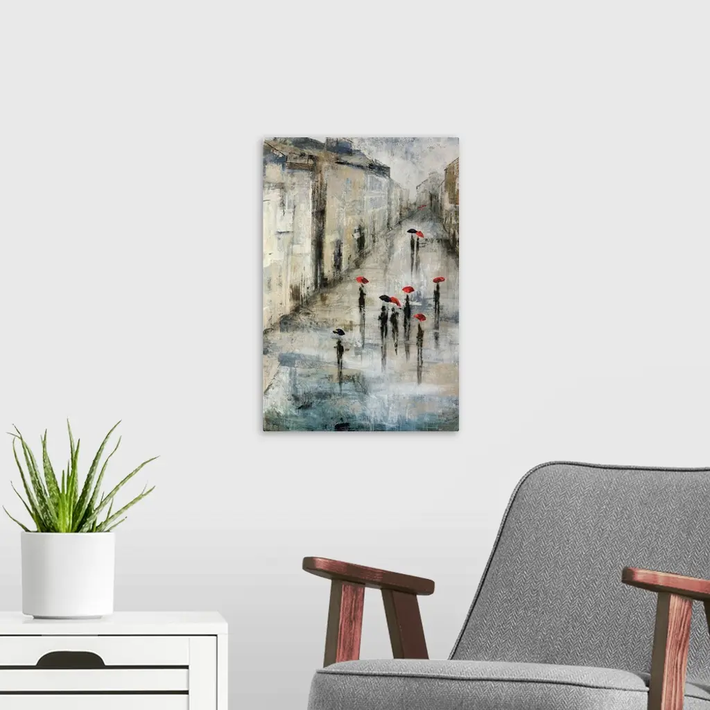 Neutral-toned painting of pedestrians holding umbrellas while walking along a promenade on a dreary day.