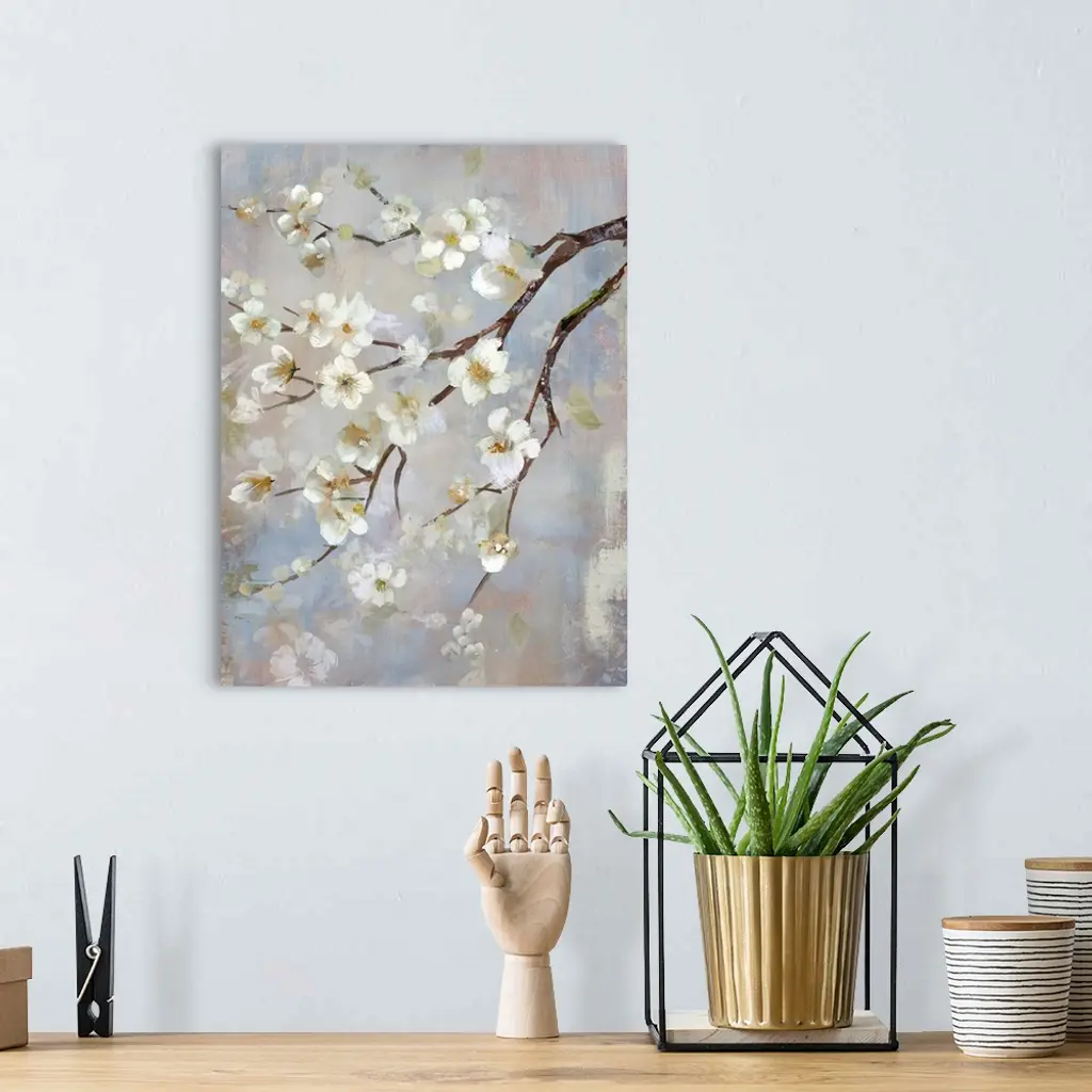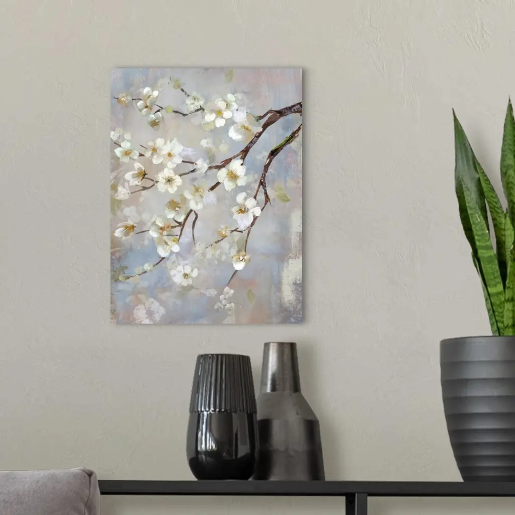 A contemporary vertical painting of a branch of white cherry blossoms against a neutral backdrop.