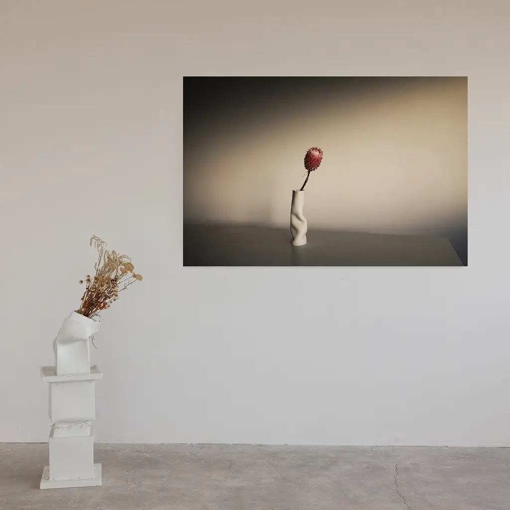 Protea in Asiago is a limited edition photograph, presented as a pigment print on Fine Art paper and mounted on dibond. Sold unframed with a Certificate of Authenticity, it is part of the "Break the Mold" project. Printed nearly life-size, the work creates the illusion of objects emerging from the image, evoking memories of abandoned ceramic factories in Nove di Bassano, Italy, and stands in dialogue with ceramic vases and lamps that critique mass production.