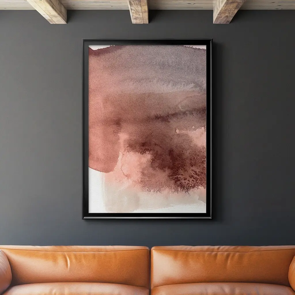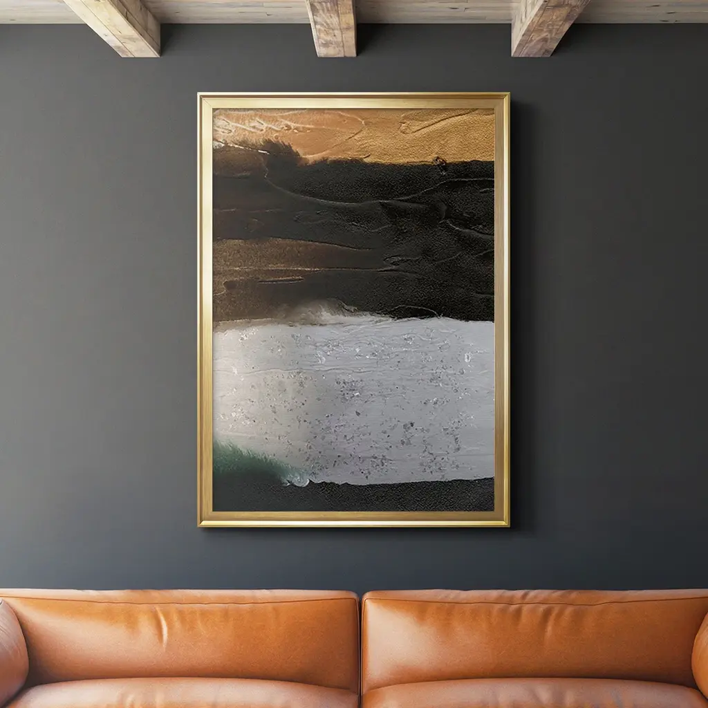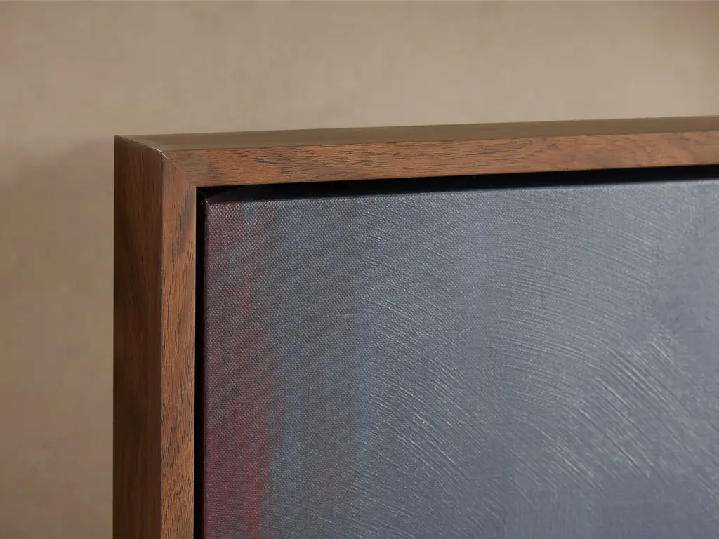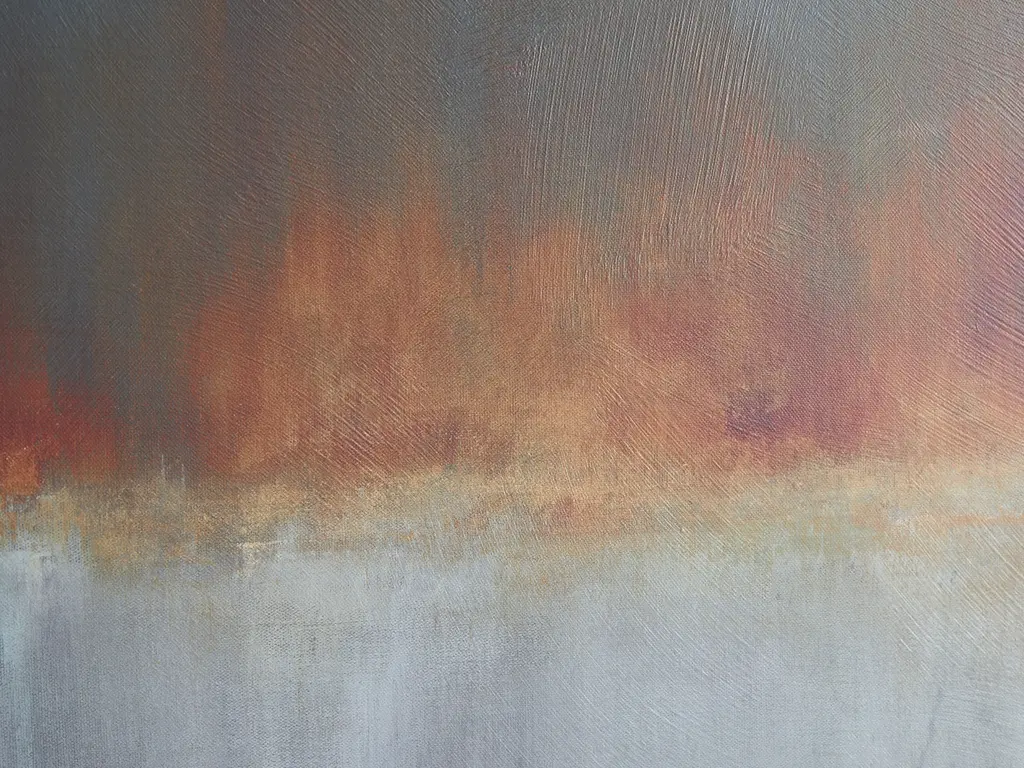 Illuminating burnt orange and cool gray tones intersect in an abstract expression of firelight in Protracted by artist Giselle Kelly. Info about artist here Need This if Available. Giclee print on gallery-wrapped canvas with hand-painted detail strokes. Polystyrene frame features a walnut finish. Hangs both vertically or horizontally from a back-mounted wire. Artist: Giselle Kelly