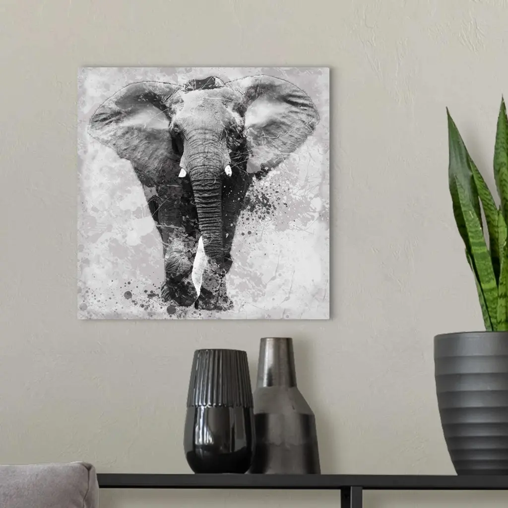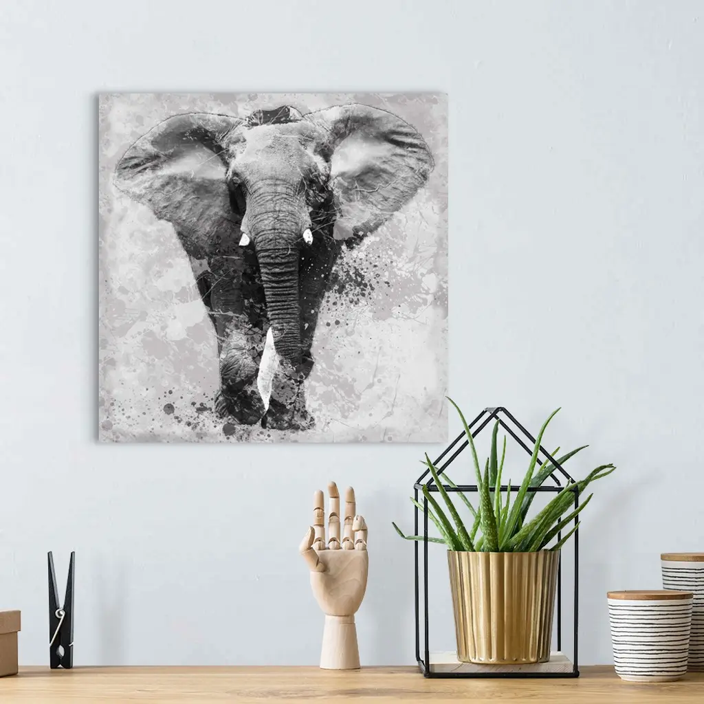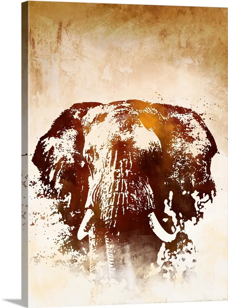 Contemporary artwork of an elephant against a textured looking background with an overall grungy and distressed look.