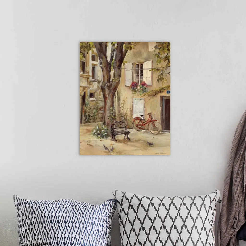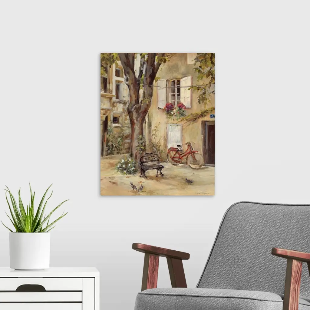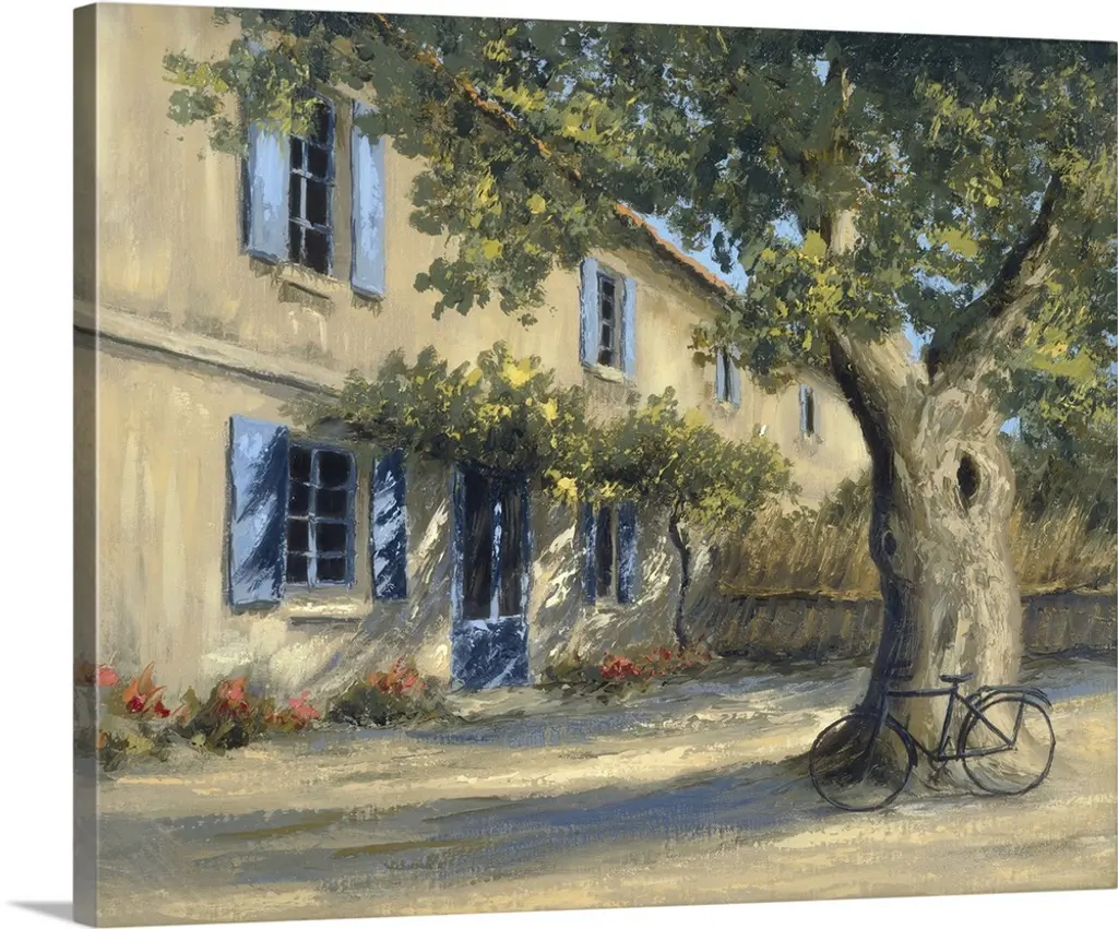 Painting of building courtyard with huge tree growing in center. The building is covered with window with shutters and flower boxes. There is a bench and bicycle at the base of the tree.