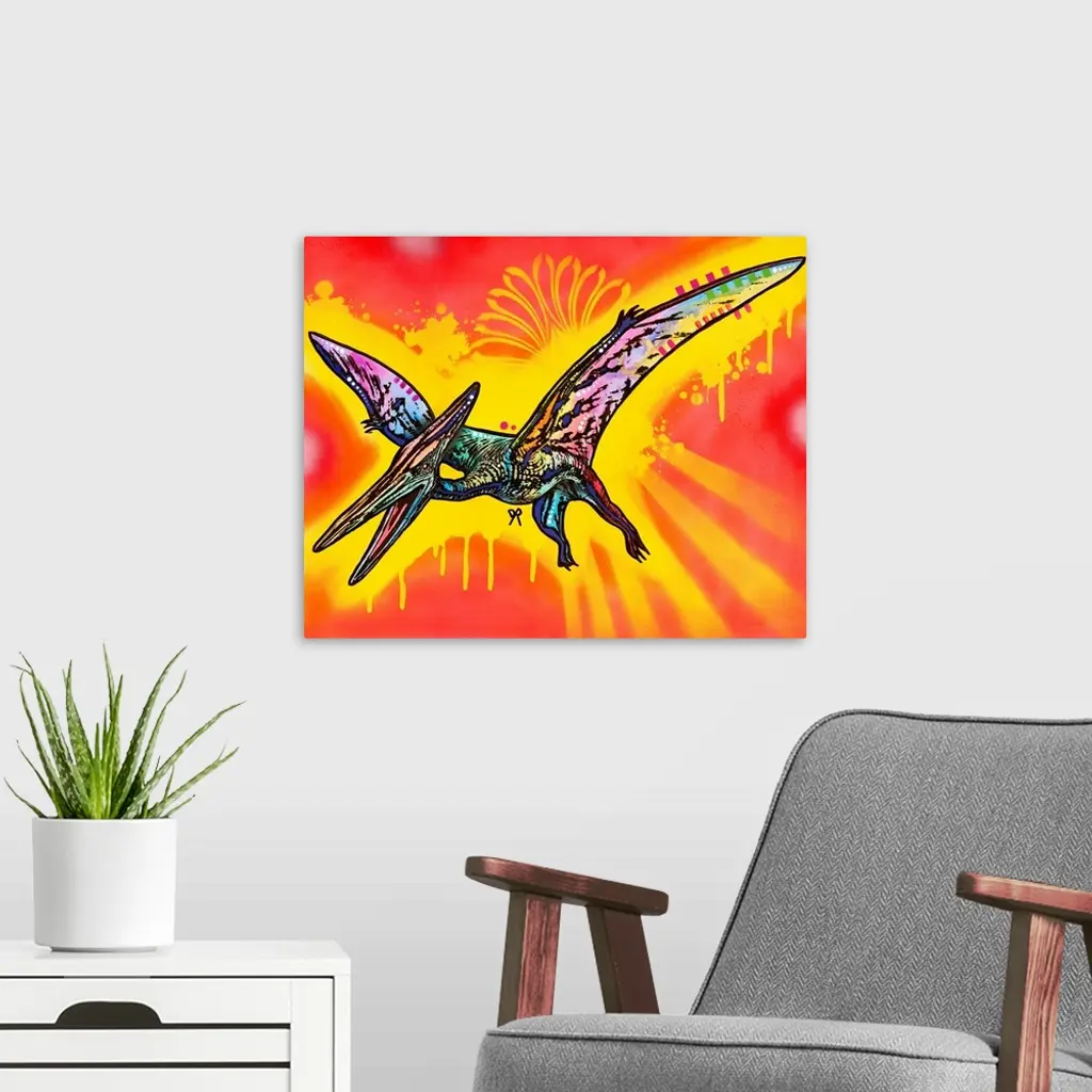 Colorful painting of a Pterodactyl on a bright red and yellow spray painted background