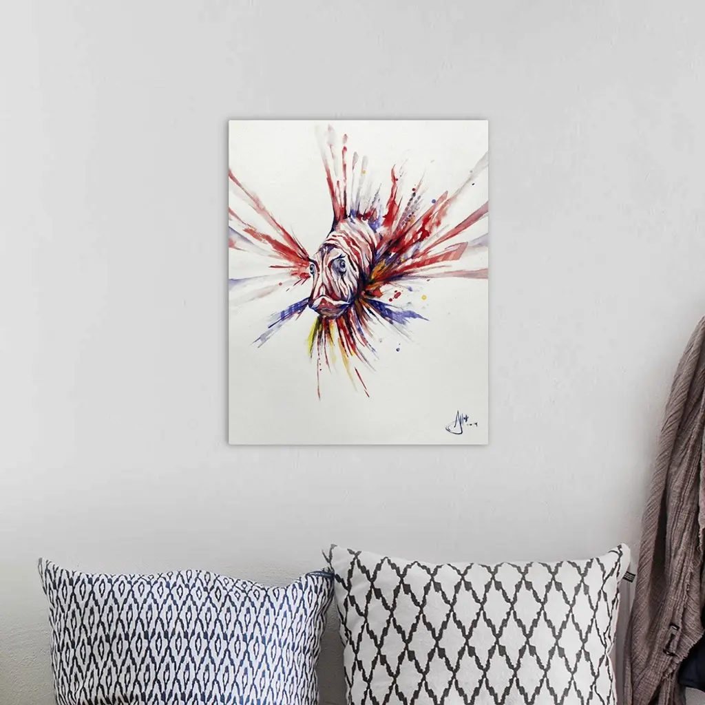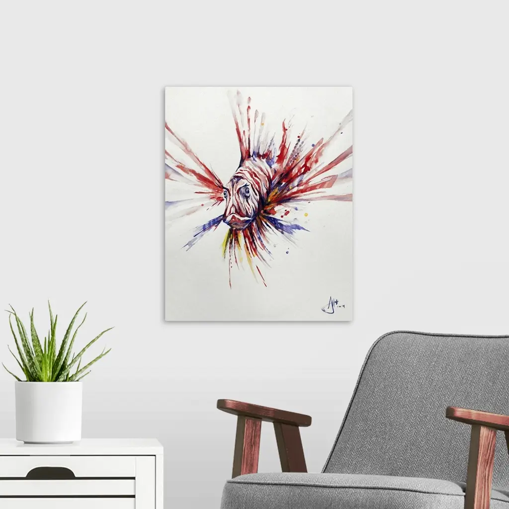 Watercolor and ink painting of a striped lionfish with large, pointed fins.