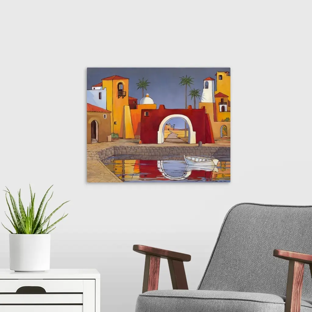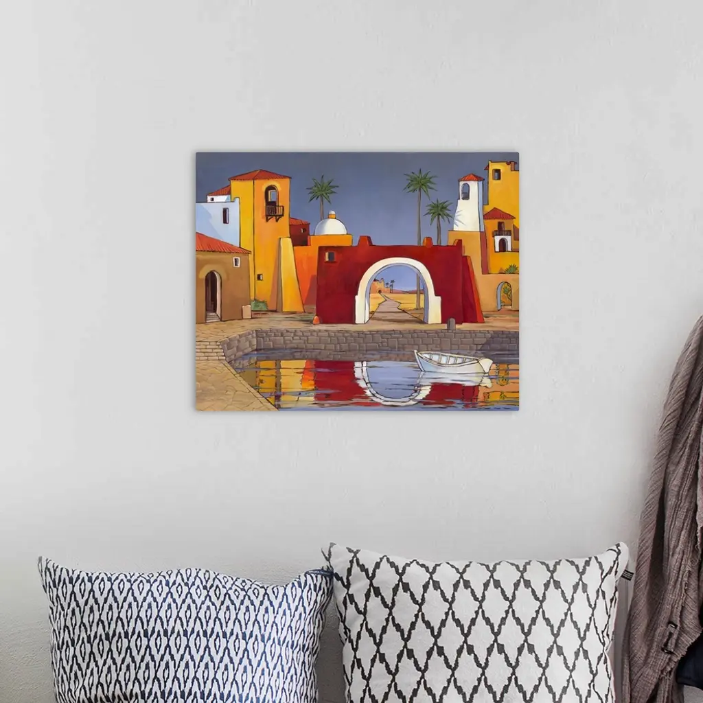 Contemporary painting of a scene in Puerto del Mar with adobe buildings and a large archway.