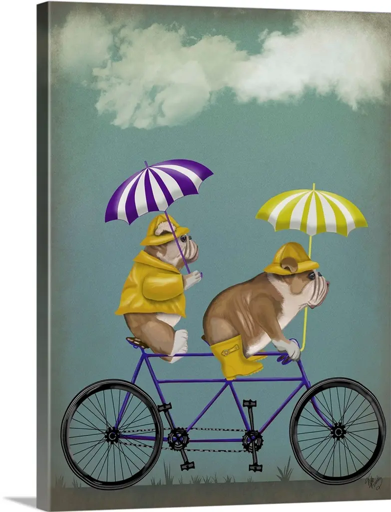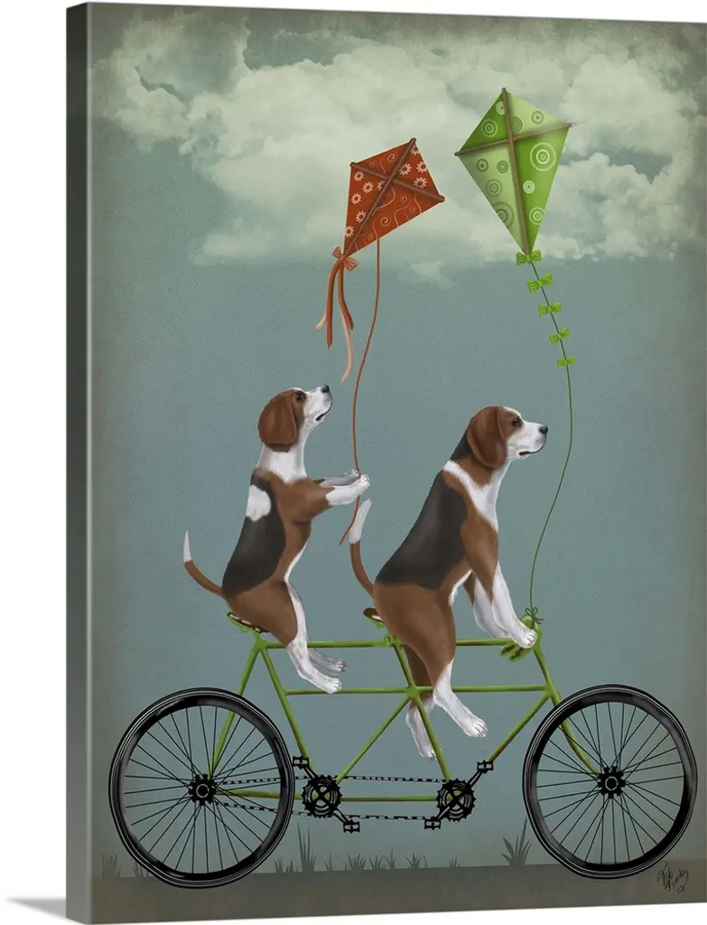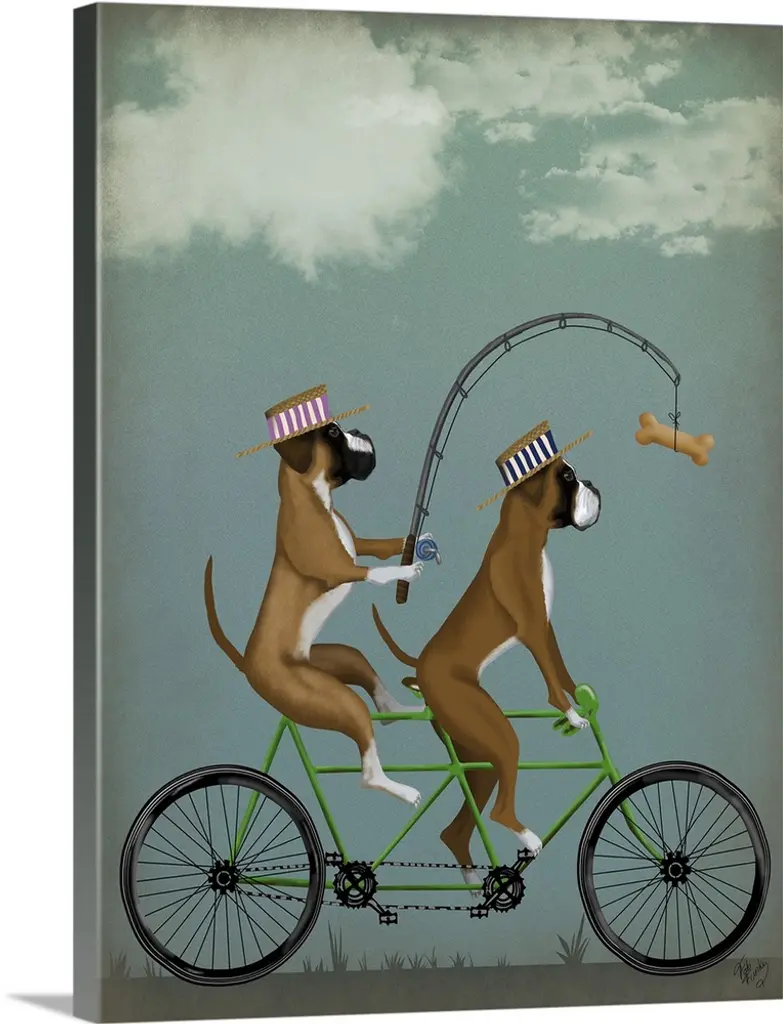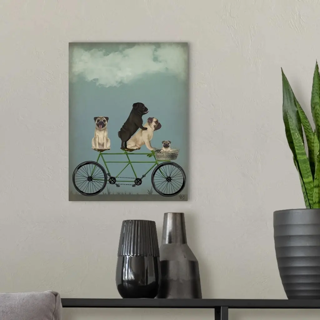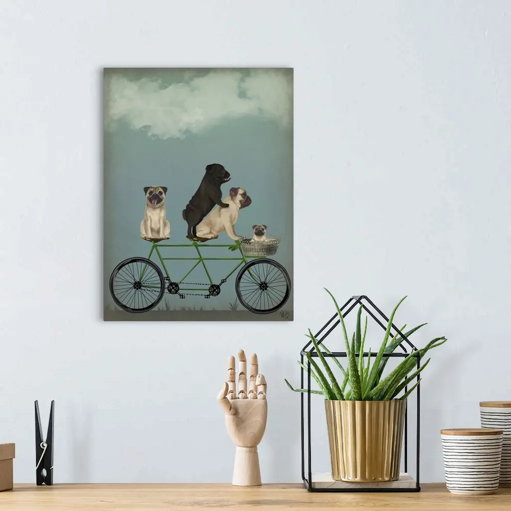 Decorative artwork of four Pugs riding on a green tandem bicycle with one puppy riding in the basket attached to the front.