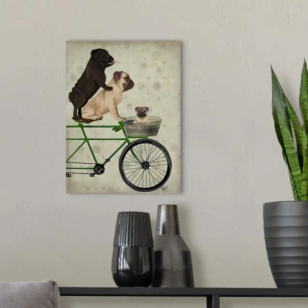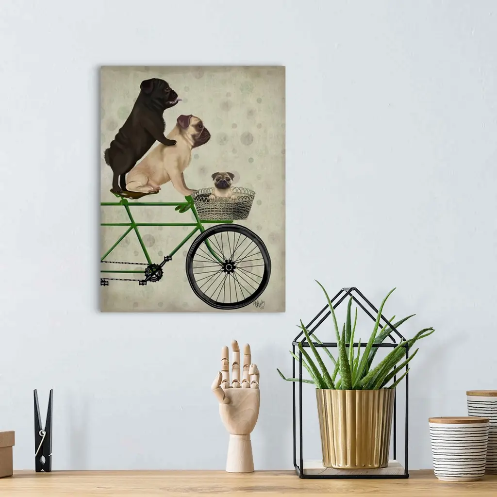 Decorative artwork of two Pugs riding on a green bicycle with a baby pug in the basket on the front.