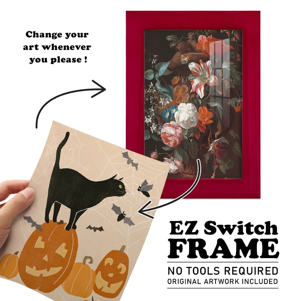 Pumpkin Patch Cats I -EZ SWITCH Framed Print w/glass-Cherry Red A delightful, framed print. Featuring a solid wood frame with real wood glass. This premium print is giclee quality. In addition, every frame features a removable back and table top stand. This allows you to change your art in the future or to just stand the art on a table for a new look. We are sure you'll enjoy our new series of EZ SWITCH Framed Art. Solid Wood Frame Real Glass Removable / Replaceable Art Built in Tabletop Stand Sizes range from 4x6 up to 12x15 - buy just one or pair them up as sets as you see fit.