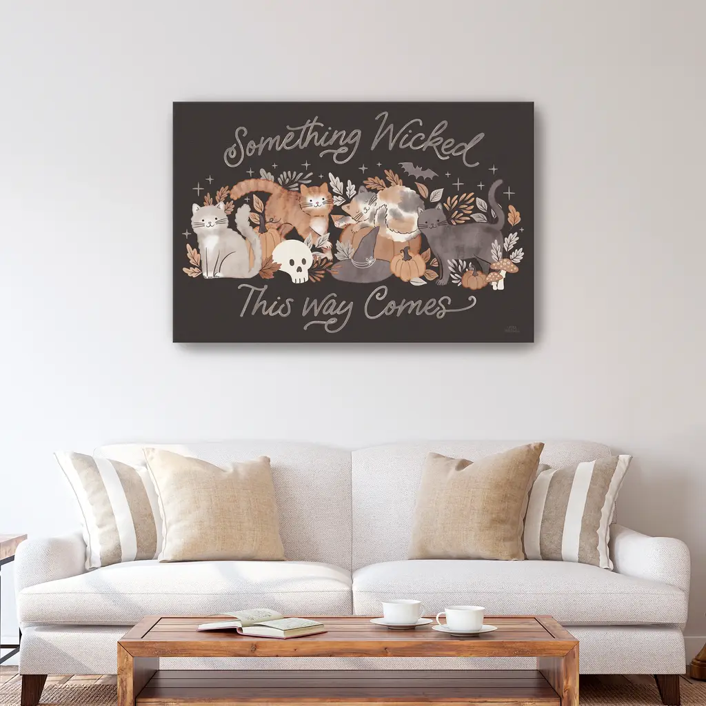 With its curious gaze and bony companion, these Halloween cats evokes mystery and festive magic. It's a classic scene where feline charm meets whimsy. Our Gallery Wrap Canvas Prints are proudly assembled with high quality materials in California, USA. Each piece is printed on a thick, archival grade canvas using Giclee technology. It is then hand-stretched by our experienced artisans over solid wood bars, which will not warp over time. The final product is a piece personally crafted for you to confidently display on your wall. Care and Assembly: Ensure that the location of your piece has little to no exposure to heat, sunlight, and moisture. Wipe clean, only if needed. Each piece includes a sawtooth hanger to hang on your wall horizontally.