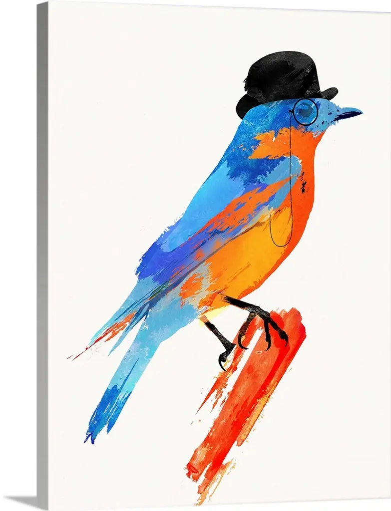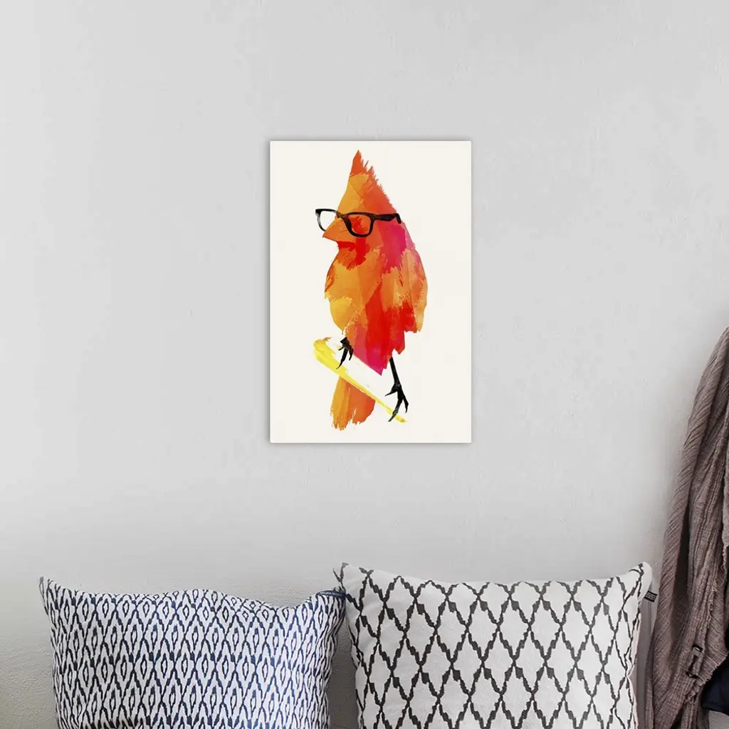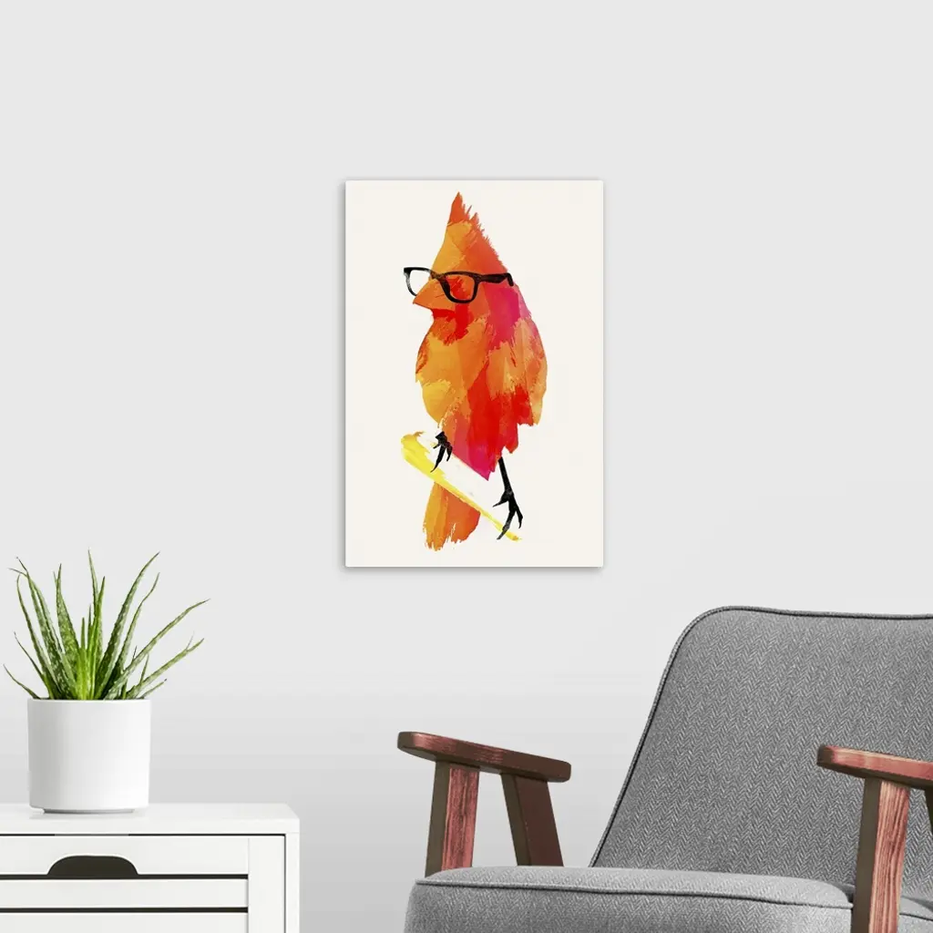 Contemporary artwork of a cardinal wearing a pair of black rim glasses.