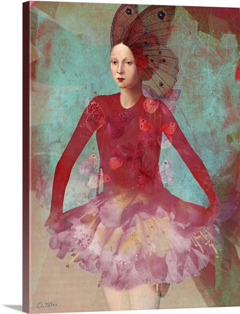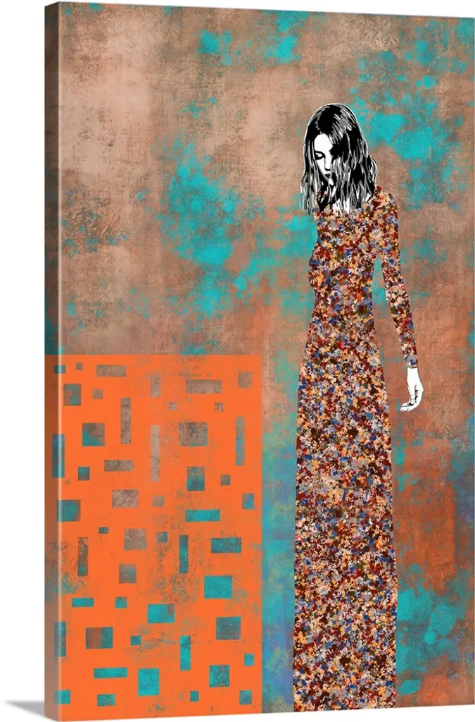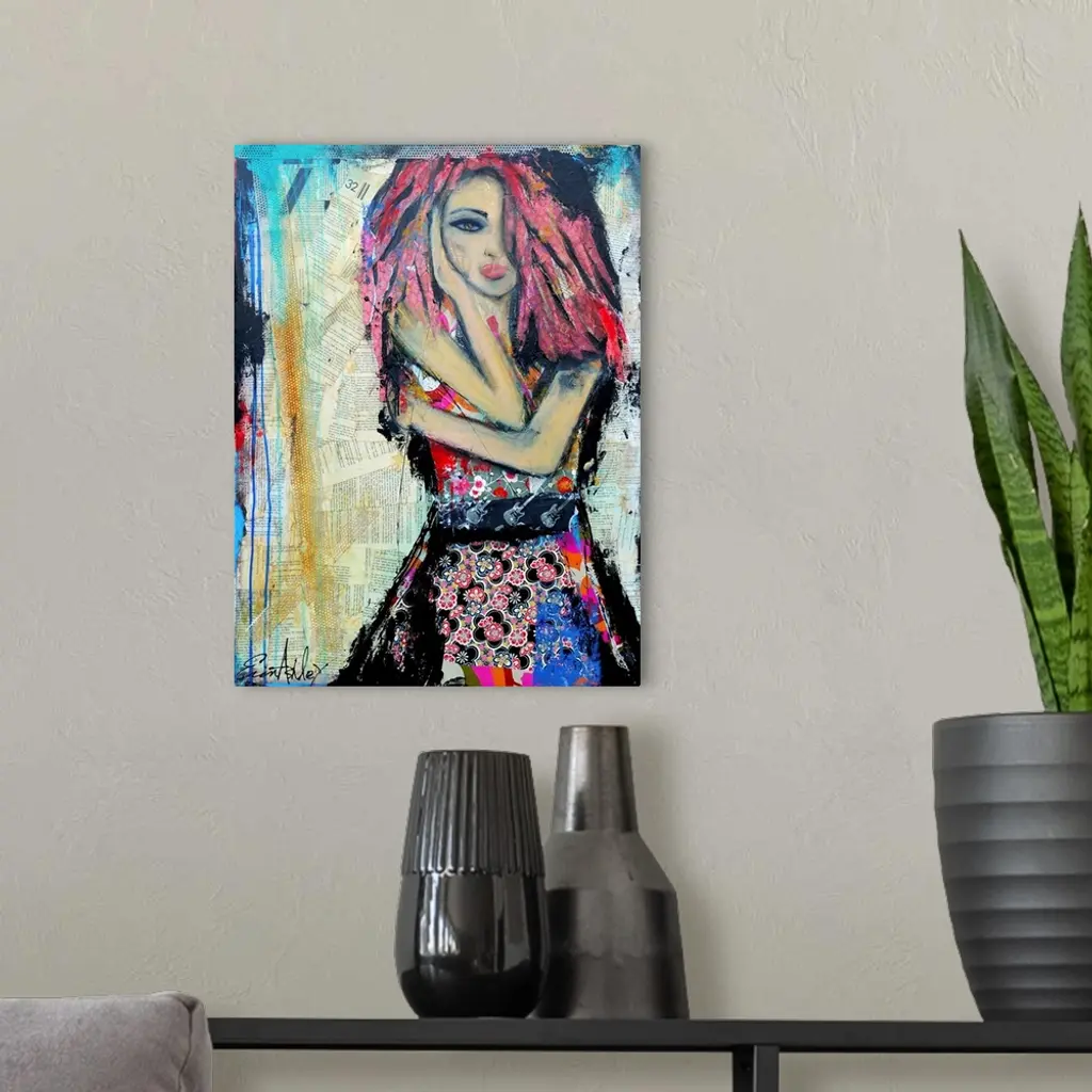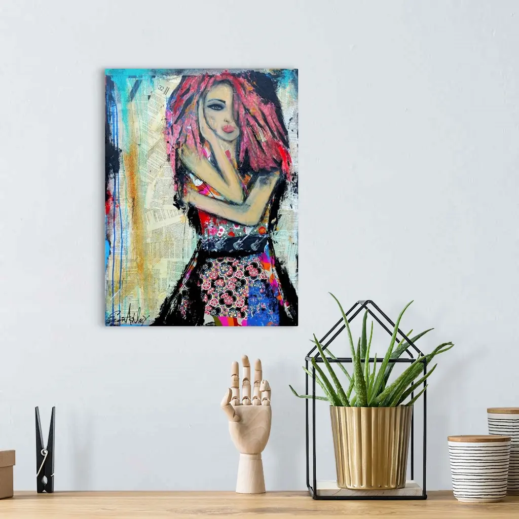 Portrait figurative artwork of a girl in a flower patterned dress with long pink hair and a guitar belt. On a background of collaged newsprint cut outs.