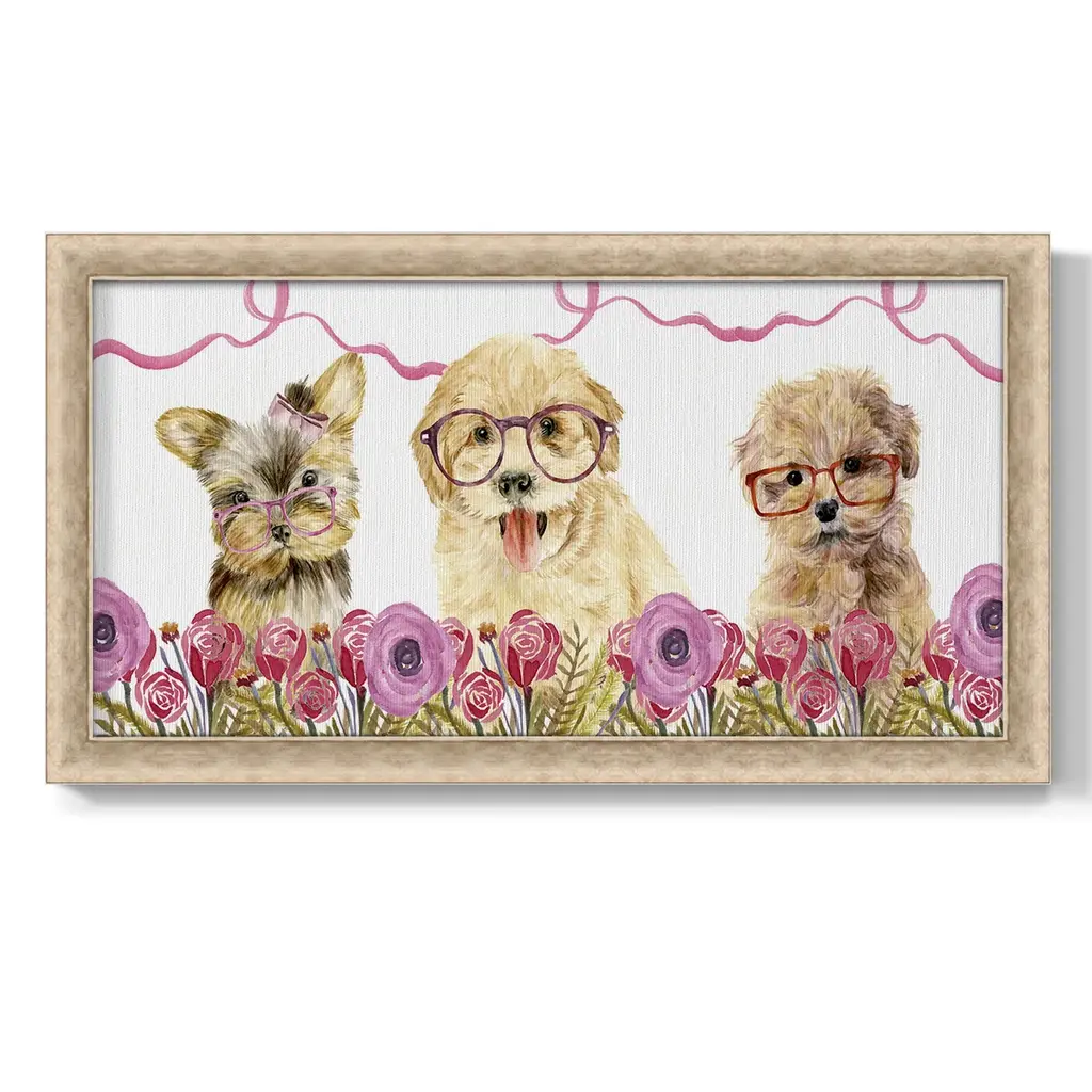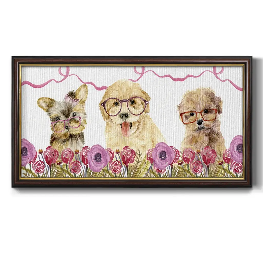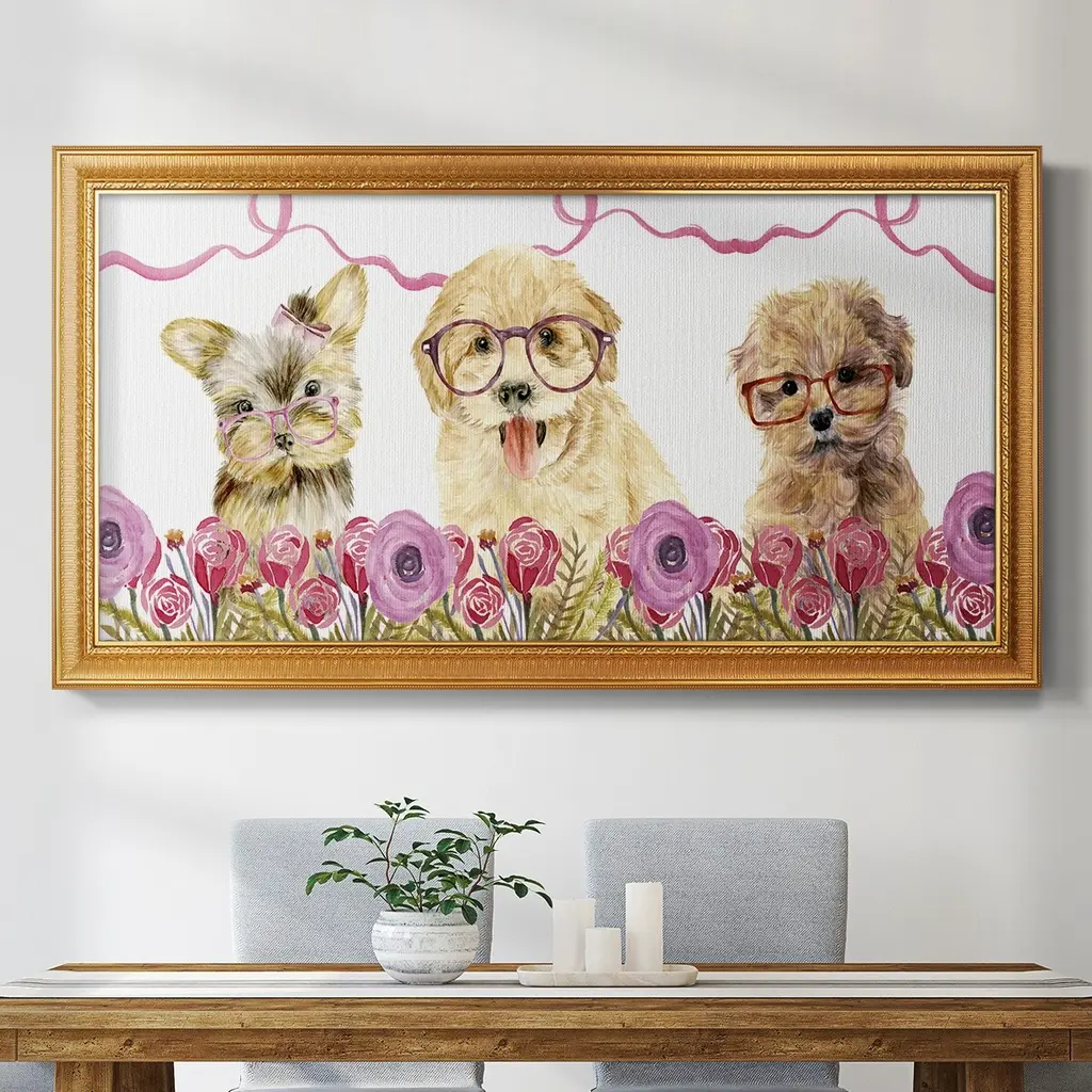 Puppy Valentine Collection D Premium Framed Canvas- Ready to Hang A Premium Framed Canvas created to last. Framed in distressed wood and available in an array of sizes and colors Featuring a beveled a solid wood stretcher bar, each piece comes ready to hand 3 SIZES AVAILABLE 21''X37'' - Overall Size 25''X45'' - Overall Size 29''x53'' - Overall Size Each piece is made to order. Each piece comes with hanging hardware. Made in the USA Ready to Hang Giclee Paper Print Acrylic Glass Beveled Matt Board