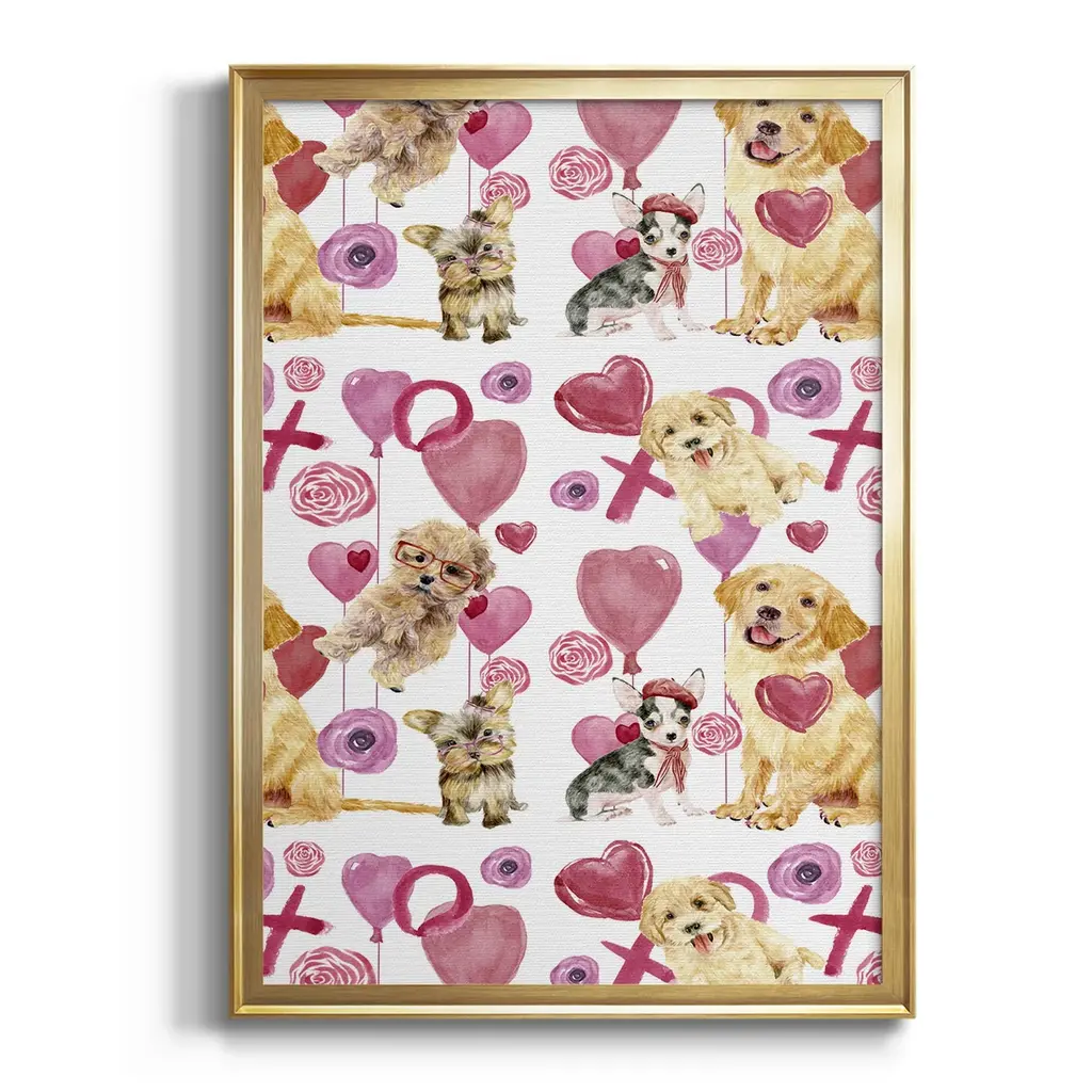 Puppy Valentine Collection E Premium Framed Print - Ready to Hang A Premium Framed Print created to last. Framed in distressed wood and available in an array of sizes and colors Featuring a beveled a solid wood stretcher bar, each piece comes ready to hand 4 SIZES AVAILABLE 30.5''X42.5'' - Overall Size 26.5'X36.5'' - Overall Size 22.5''x30.5'' - Overall Size 18.5''x24.5'' - Overall Size Each piece is made to order. Each piece comes with hanging hardware. Made in the USA Ready to Hang