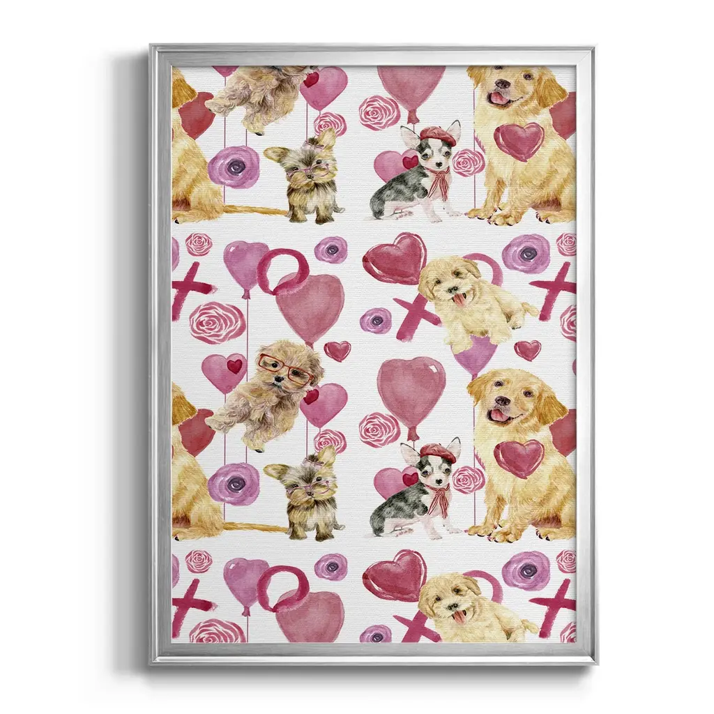 Puppy Valentine Collection E Premium Framed Print - Ready to Hang A Premium Framed Print created to last. Framed in distressed wood and available in an array of sizes and colors Featuring a beveled a solid wood stretcher bar, each piece comes ready to hand 4 SIZES AVAILABLE 30.5''X42.5'' - Overall Size 26.5'X36.5'' - Overall Size 22.5''x30.5'' - Overall Size 18.5''x24.5'' - Overall Size Each piece is made to order. Each piece comes with hanging hardware. Made in the USA Ready to Hang