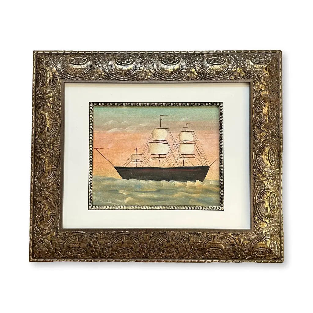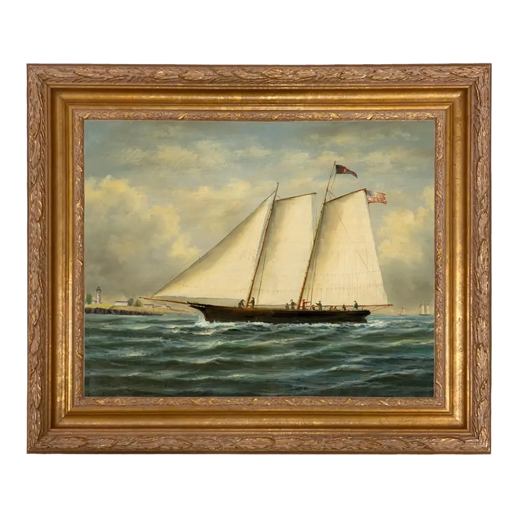 Accurate reproduction of the original oil painting by Danish painter Antonio Jacobsen (1850-1910). This image is printed on canvas, mounted to a board and treated with a historic looking varnish. The frame is antiqued gold resin. The back is finished with craft paper and a sawtooth hanger. Made in the USA. • Painting: 5" x 6" • Finished frame size: 8-1/2" x 9-1/2" • Frame width: 2" • Frame thickness: 1"