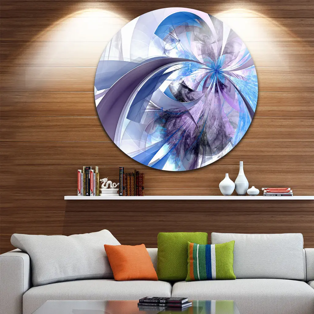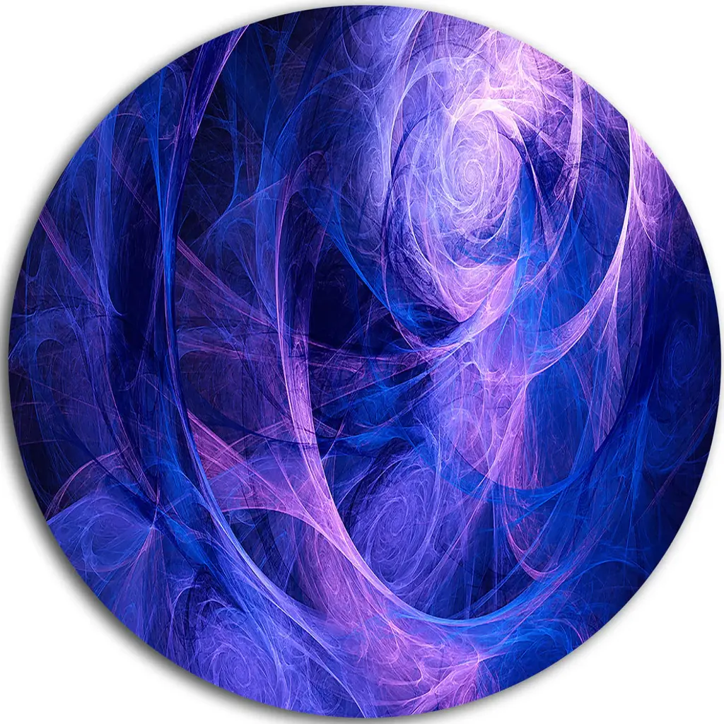 Bring Contemporary Abstraction to your home with this large Circle Metal wall art. This Purple and Blue Symmetrical Fractal Flower Metal Artwork makes it the focal point of any room or office. - White Gloss Coating ensures colors are extra vibrant with light reflection.- Aluminum grade Sheet Metal with 1 inch mounting frame on the back giving the illusion that the artwork is floating on the wall..- Mounting Brackets are included along with instructions.- High Quality Digital images are created directly into a glossy aluminum panel producing a stunning and captivating print into the glossy finish of the metal.- Water, Fire and Scratch resistant HD Aluminum panels.- Looks better than any photo paper and guaranteed to last at least 20 years- Easy to clean with a microfiber cloth. Colors are far superior to regular Canvas Art. - Easy to Hang
