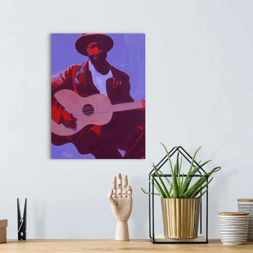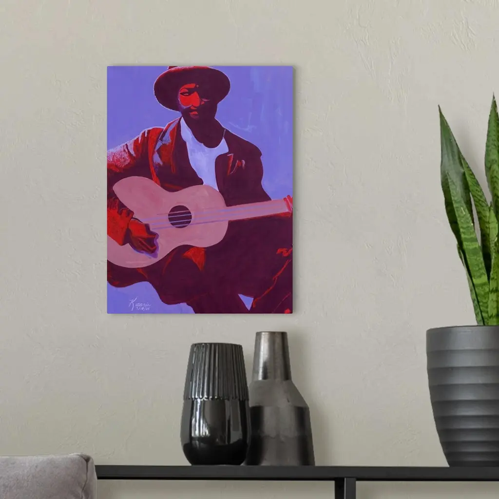 Contemporary artwork of a musician holding a guitar while sitting down. Half of his body is shadowed.
