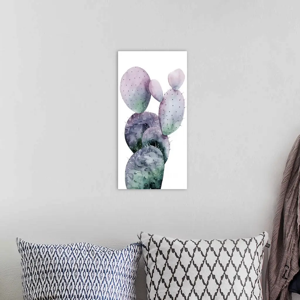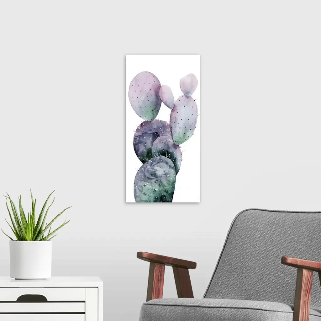 Watercolor painting of a purple and green toned cactus on a white panel background.