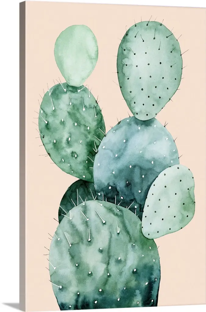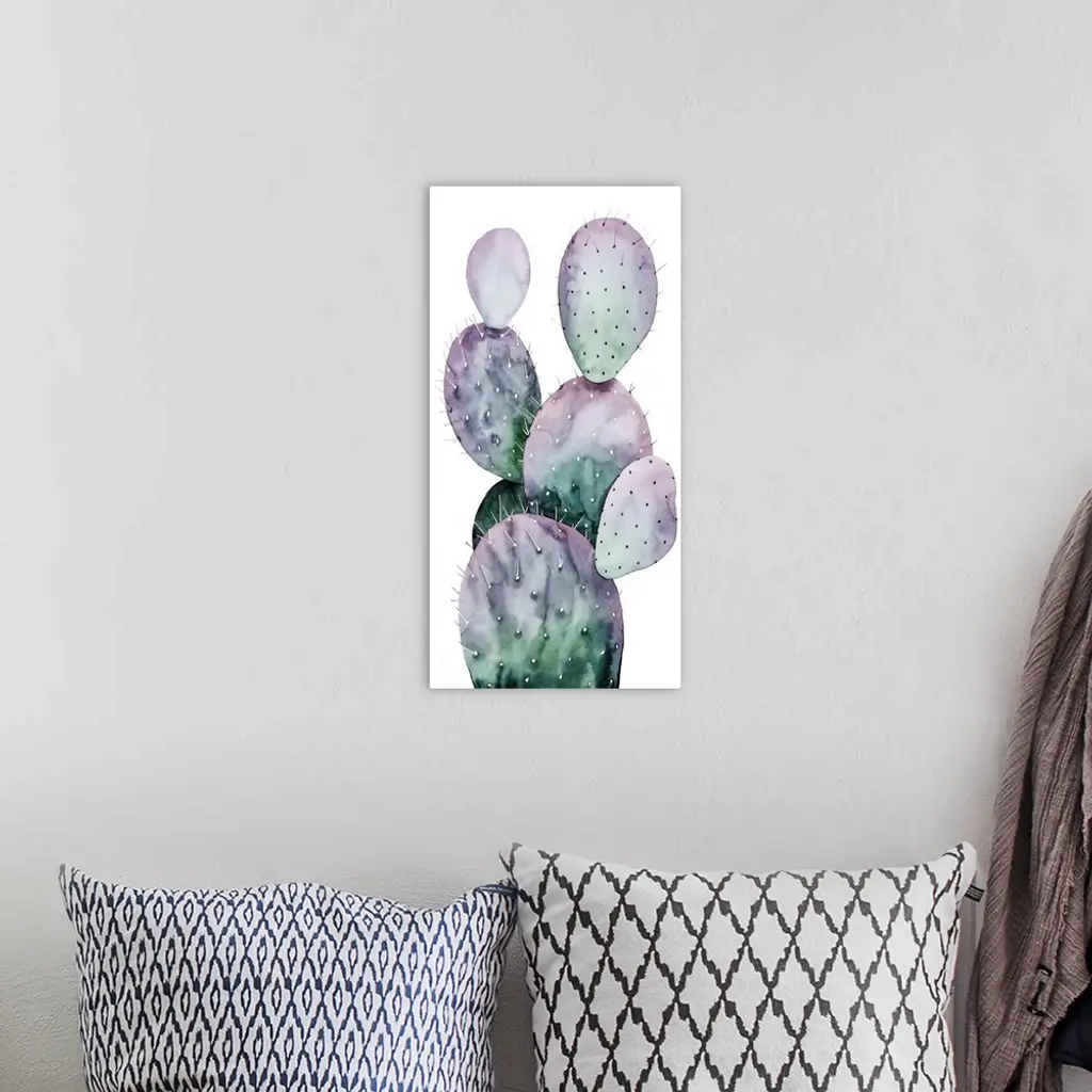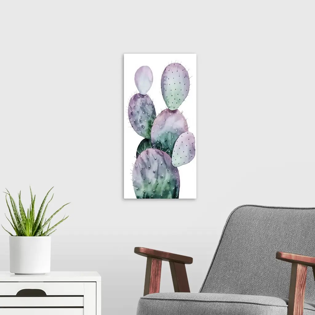 Watercolor painting of a purple and green toned cactus on a white panel background.