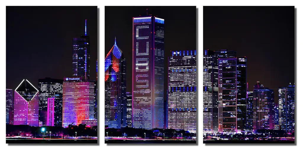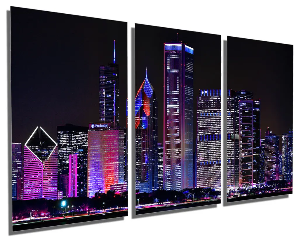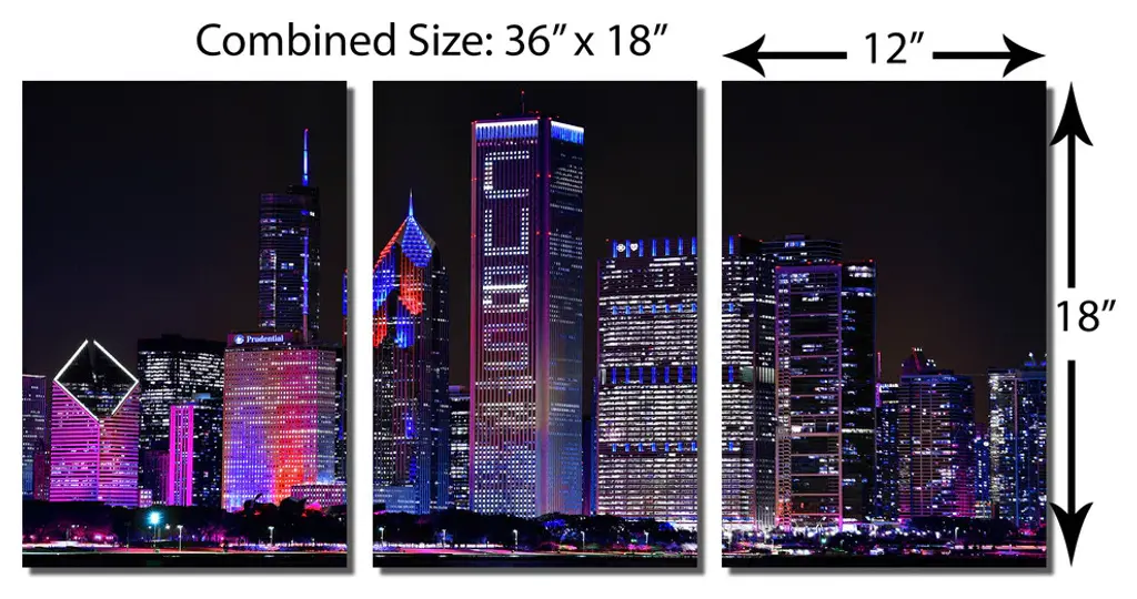 36" x 18" total size. Ready To Hang! (3 pieces - 12" x 18" each). 3 Panel Split (Triptych) Metal Print of Chicago, Illinois skyline at night in pink purple, Chicago cubs lights. Modern metal wall art for home or office wall decor & interior design. Printed on Luxurious, HD aluminum glossy metal panels. Multi panel art.. HD aluminum panels. Metal print wall art. Includes Shadow Wall Mount on the back.• Aluminum Metal Wall Art• Made in USA• Ready to hang - No assembly required• Shadow mount hardware on the back• 0.045" thick HD Aluminum Panels• Scratch resistant, glossy finish• Superb color clarity, luxurious prints• Epson printing process• For indoor or moisture rich environment use• Easy to clean. Gently wipe with microfiber cloth.