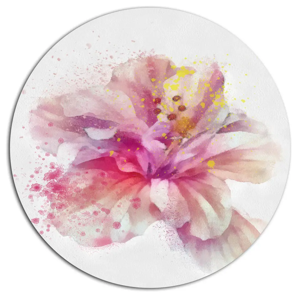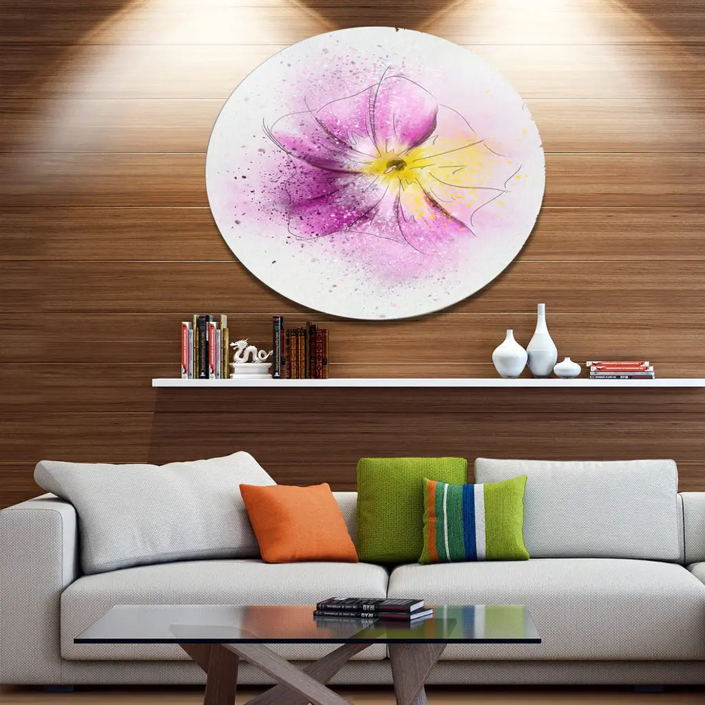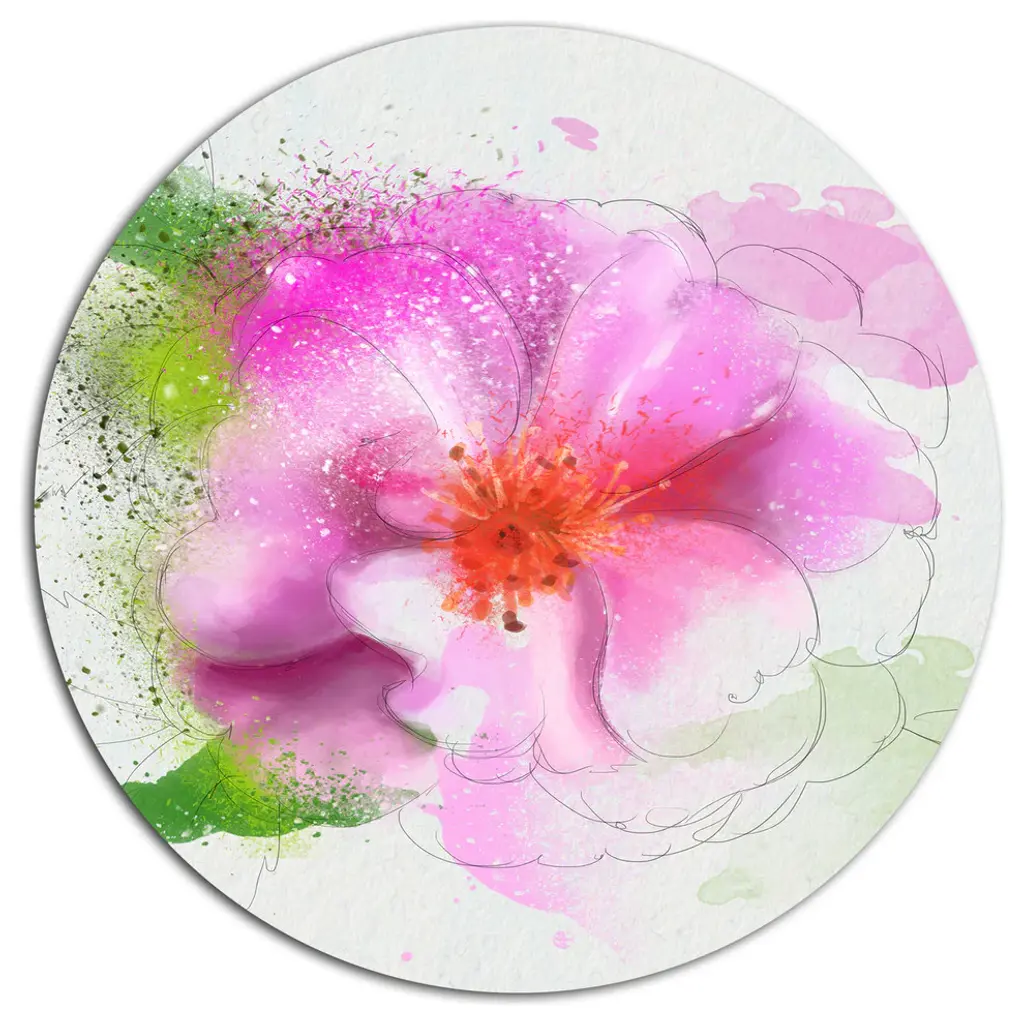 Bring Contemporary Abstraction to your home with this large Circle Metal wall art. This Purple Flower Sketch with Splashes Metal Artwork makes it the focal point of any room or office. - White Gloss Coating ensures colors are extra vibrant with light reflection.- Aluminum grade Sheet Metal with 1 inch mounting frame on the back giving the illusion that the artwork is floating on the wall..- Mounting Brackets are included along with instructions.- High Quality Digital images are created directly into a glossy aluminum panel producing a stunning and captivating print into the glossy finish of the metal.- Water, Fire and Scratch resistant HD Aluminum panels.- Looks better than any photo paper and guaranteed to last at least 20 years- Easy to clean with a microfiber cloth. Colors are far superior to regular Canvas Art. - Easy to Hang