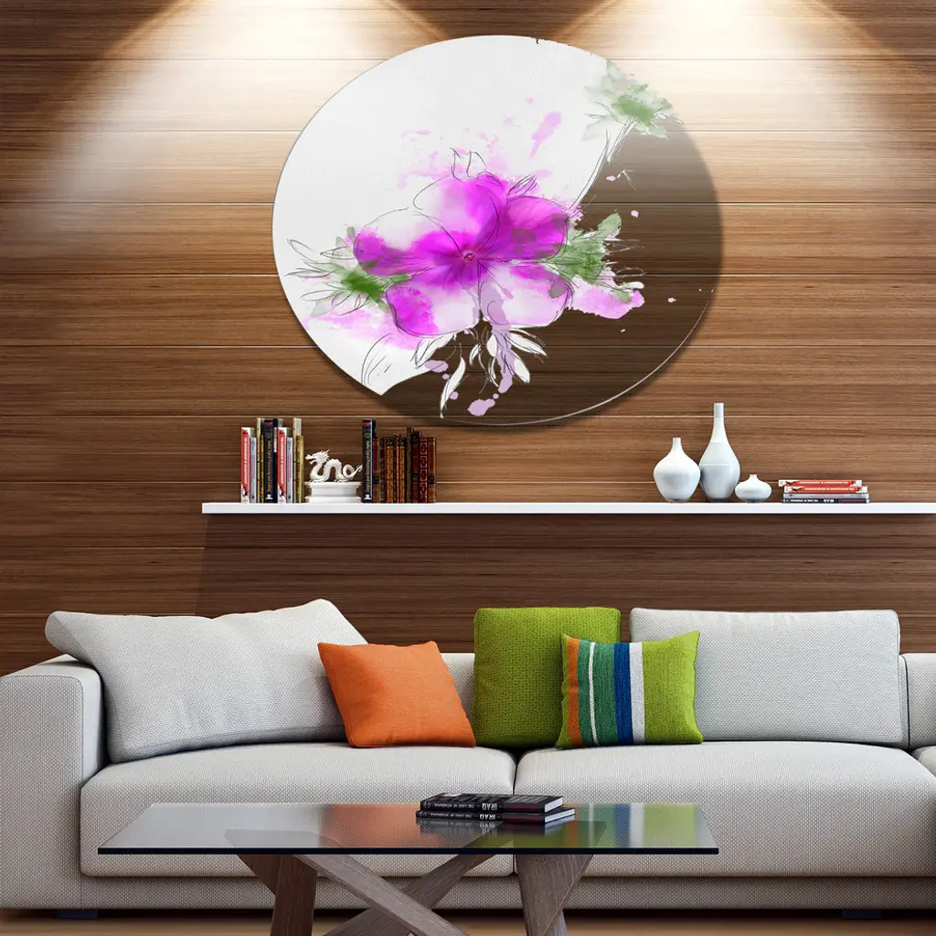 Bring Contemporary Abstraction to your home with this large Circle Metal wall art. This Purple Flower Sketch with Stem Metal Artwork makes it the focal point of any room or office. - White Gloss Coating ensures colors are extra vibrant with light reflection.- Aluminum grade Sheet Metal with 1 inch mounting frame on the back giving the illusion that the artwork is floating on the wall..- Mounting Brackets are included along with instructions.- High Quality Digital images are created directly into a glossy aluminum panel producing a stunning and captivating print into the glossy finish of the metal.- Water, Fire and Scratch resistant HD Aluminum panels.- Looks better than any photo paper and guaranteed to last at least 20 years- Easy to clean with a microfiber cloth. Colors are far superior to regular Canvas Art. - Easy to Hang