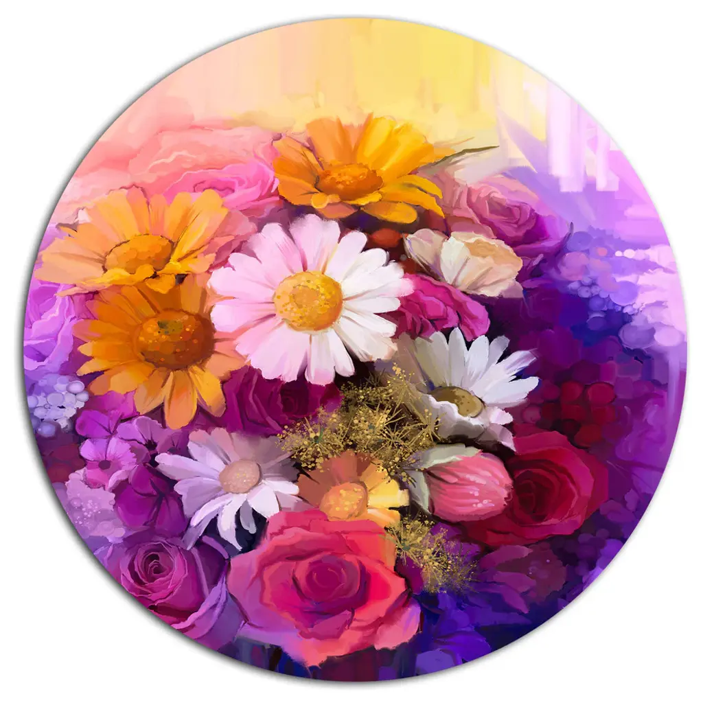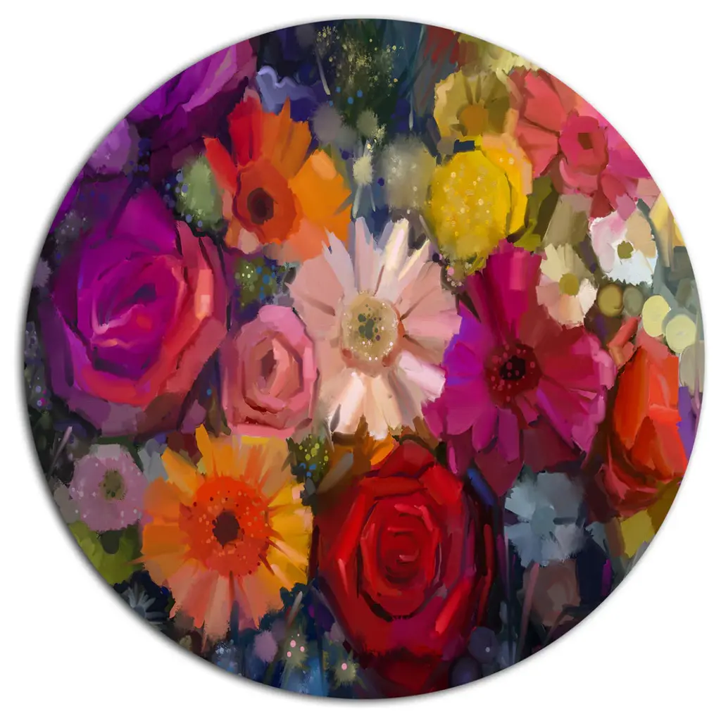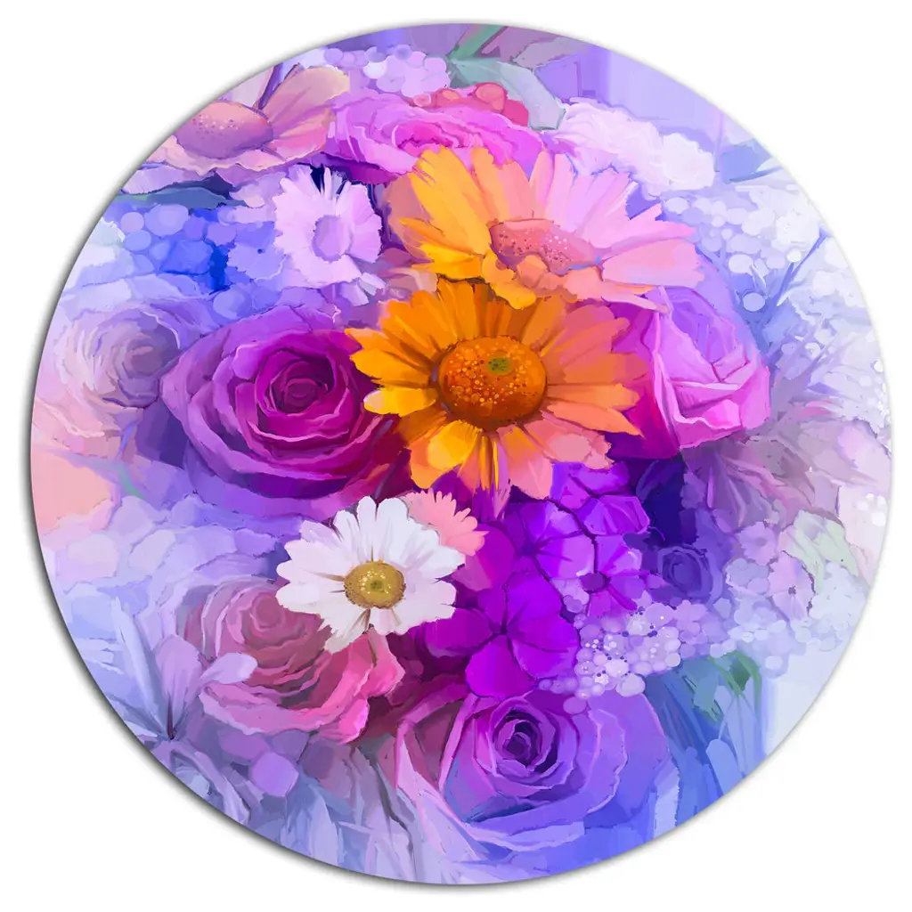 Bring Contemporary Abstraction to your home with this large Circle Metal wall art. This Purple Flowers on Colorful Background Metal Artwork makes it the focal point of any room or office. - White Gloss Coating ensures colors are extra vibrant with light reflection.- Aluminum grade Sheet Metal with 1 inch mounting frame on the back giving the illusion that the artwork is floating on the wall..- Mounting Brackets are included along with instructions.- High Quality Digital images are created directly into a glossy aluminum panel producing a stunning and captivating print into the glossy finish of the metal.- Water, Fire and Scratch resistant HD Aluminum panels.- Looks better than any photo paper and guaranteed to last at least 20 years- Easy to clean with a microfiber cloth. Colors are far superior to regular Canvas Art. - Easy to Hang