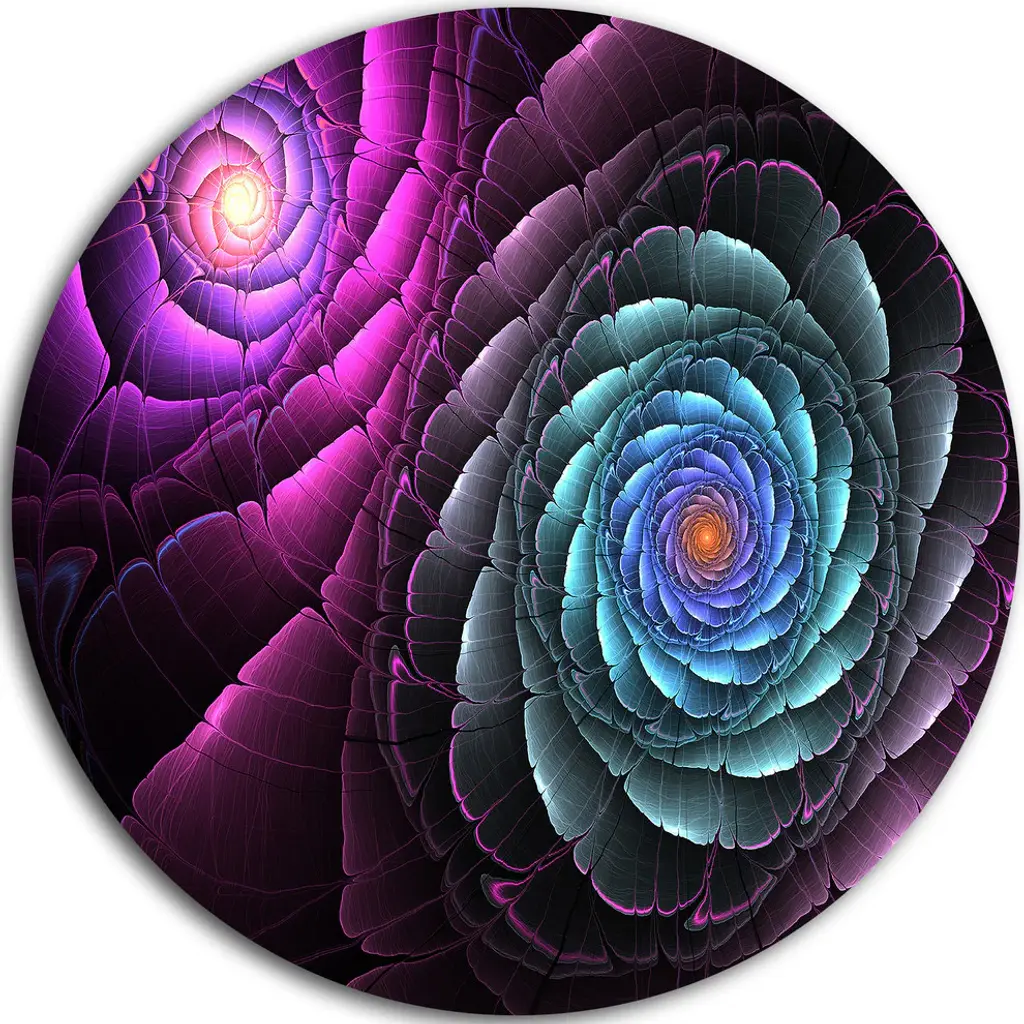 Bring Contemporary Abstraction to your home with this large Circle Metal wall art. This Purple Fractal Flower in Dark Metal Artwork makes it the focal point of any room or office. - White Gloss Coating ensures colors are extra vibrant with light reflection.- Aluminum grade Sheet Metal with 1 inch mounting frame on the back giving the illusion that the artwork is floating on the wall..- Mounting Brackets are included along with instructions.- High Quality Digital images are created directly into a glossy aluminum panel producing a stunning and captivating print into the glossy finish of the metal.- Water, Fire and Scratch resistant HD Aluminum panels.- Looks better than any photo paper and guaranteed to last at least 20 years- Easy to clean with a microfiber cloth. Colors are far superior to regular Canvas Art. - Easy to Hang