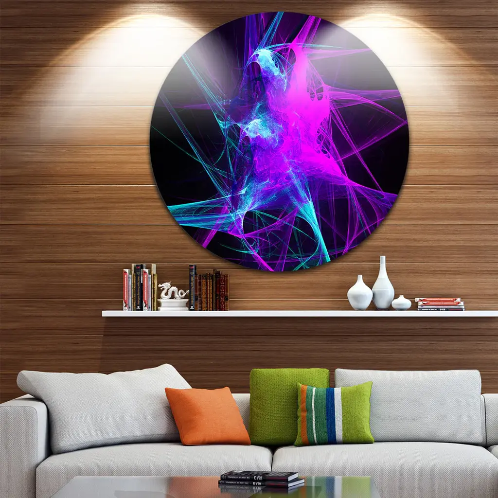 Bring Contemporary Abstraction to your home with this large Circle Metal wall art. This Purple Glowing Ball of Smoke Metal Artwork makes it the focal point of any room or office. - White Gloss Coating ensures colors are extra vibrant with light reflection.- Aluminum grade Sheet Metal with 1 inch mounting frame on the back giving the illusion that the artwork is floating on the wall..- Mounting Brackets are included along with instructions.- High Quality Digital images are created directly into a glossy aluminum panel producing a stunning and captivating print into the glossy finish of the metal.- Water, Fire and Scratch resistant HD Aluminum panels.- Looks better than any photo paper and guaranteed to last at least 20 years- Easy to clean with a microfiber cloth. Colors are far superior to regular Canvas Art. - Easy to Hang